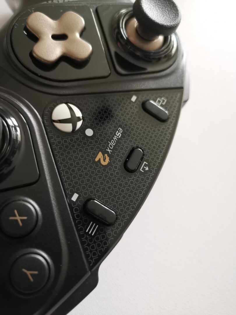 Mając Thrustmaster eSwap X2 Pro Controller szybko można odczuć, że coś trzyma się w dłoniach. To całe 300 g zwiększające szansę na zwycięstwo. Na dodatek nie tylko w bijatykach, natomiast z myślą o nich tak naprawdę powstał ten model. Wnętrze opakowania zostało wyścielone pianką, która nadaje całości elegancji i wrażenia, iż właśnie rozpoczyna się przygodę z szanowanym i cenionym towarzyszem. Całość została zachowana w odcieniach czerni oraz złota w wysokiej jakości plastikowym tworzywie. Wizualnie kontroler sprawia wrażenie ekskluzywnego, a zarazem solidnego. Na łopatkach znajdują się nieznaczne żłobienia, które zasadniczo ani nie przeszkadzają, ani nie pomagają w trakcie rozgrywki. Panel z przyciskiem Xbox, jak i same wymienne moduły, zostały pokryte błyszczącym tworzywem. Natomiast na lewym ramieniu znajdziemy logo producenta. Mieszanina styli!
