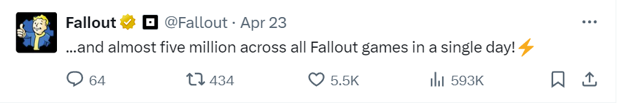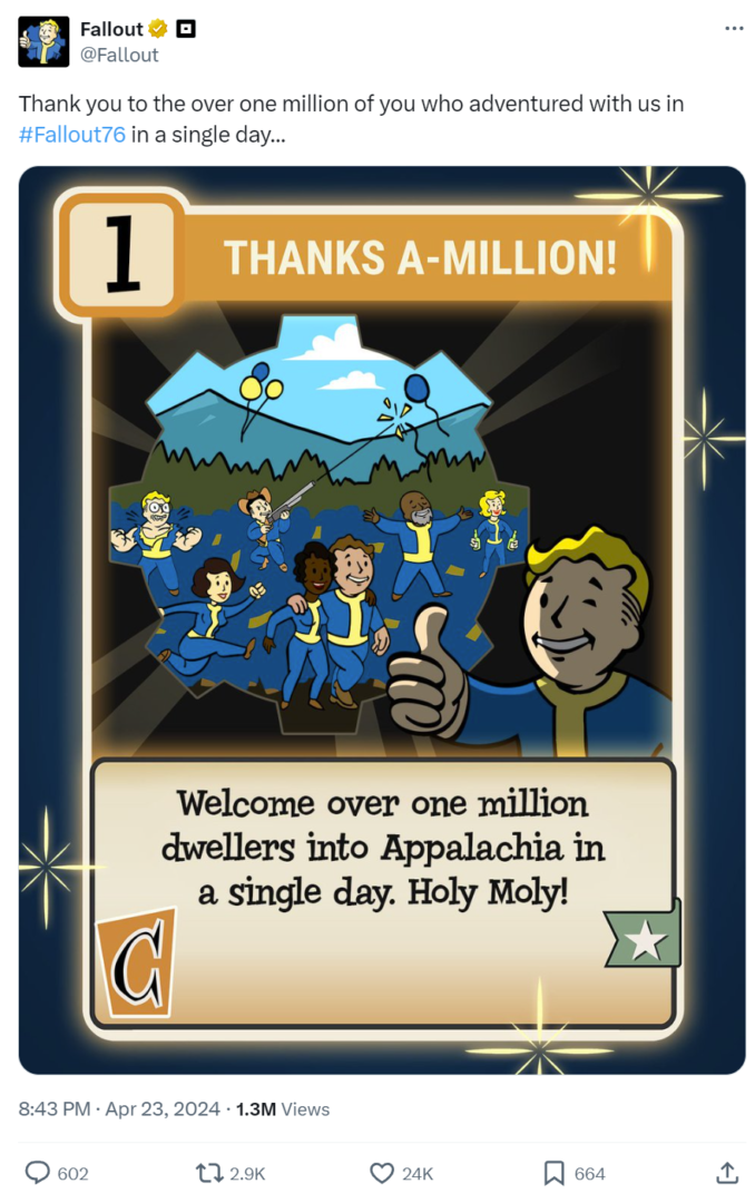 Ostatnie tygodnie to święto graczy Fallouta i ogromny sukces Bethesdy. Serial przyciągnął przed ekrany fanów serii, gier wideo ogólnie oraz tych, po prostu ciekawych. Obok jednak bycia serialem, jest też świetną motywacją, by odświeżyć sobie gry z serii. I każdego tygodnia aktualnie słyszymy o kolejnym sukcesie! Tak jak teraz, gdy dwa dni temu Fallout 76 świętował milion graczy na serwerach w ciągu jednego dnia.