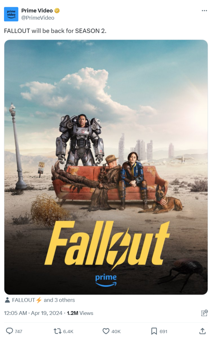 Sama seria Fallout ma się aktualnie lepiej, niż kiedykolwiek wcześniej. Gry królują na listach sprzedaży i w zestawieniach popularności. Od swojej premiery zaledwie w zeszły czwartek, serial przebił półtora miliona wyświetleń na platformie, zgarniając tytuł najpopularniejszej produkcji minionego tygodnia.