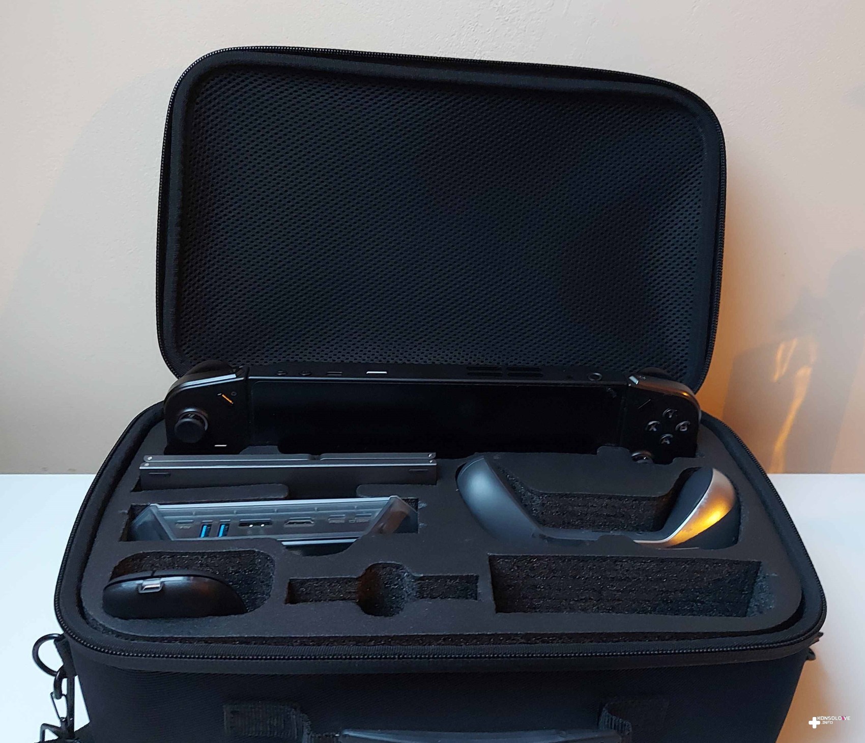 Bez problemu włożymy do niego małą klawiaturę, myszkę, ładowarkę do komputera, stację dokującą, nasadkę na prawy kontroler Legion Go, a nawet pada. Naturalnie nie brakuje miejsca dla najważniejszego sprzętu – komputera Lenovo Legion Go. Przyznaję, że bardzo podobają mi się wyraźne miękkie wytłoczki. Dzięki nim nie dość, że każde akcesorium ma swoje miejsce, to jeszcze nie uszkodzi się, a jednocześnie nie będzie się przemieszczało podczas transportu.