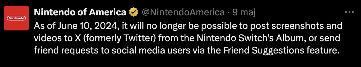 Nintendo ogłosiło, że wkrótce zakończy się wsparcie dla serwisu Twitter ( X ) na konsolach Switch. Gracze nie będą mogli wysyłać zrzutów ekranu na ten serwis społecznościowy bezpośrednio z konsoli. Dodatkowo zniknie opcja sugerowania znajomych na podstawie tego, kogo obserwujemy w serwisie Elona Muska. Wszystko to zostanie wyłączone 10 czerwca.