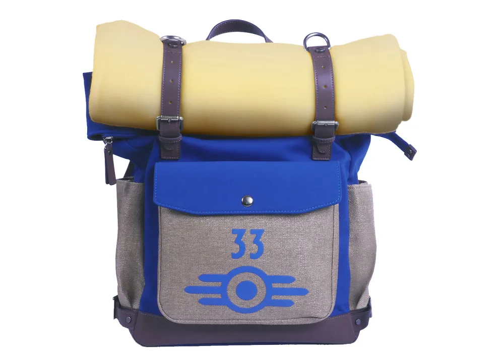 Plecak Lucy z logo Vault 33 pomieści 16-calowy laptop i 9 dodatkowych kieszeni na przeróżne przedmioty. Ma pojemność 20 litrów, a w zestawie znajduje się jeszcze żółty polarowy koc o rozmiarach 130 x 80 cm.