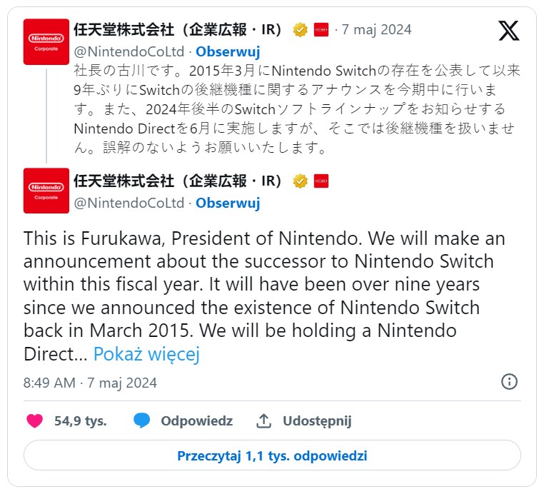 Wiele osób czeka na pewno na konsolę Nintendo Switch 2. Japoński gigant postawił sprawę jasno. Na najbliższej prezentacji nie będzie żadnej wzmianki o następcy Switcha. Zobaczymy natomiast materiały poświęcone grom zmierzającym na aktualnie dostępną konsolę. Pełne oświadczenie możecie przeczytać niżej: