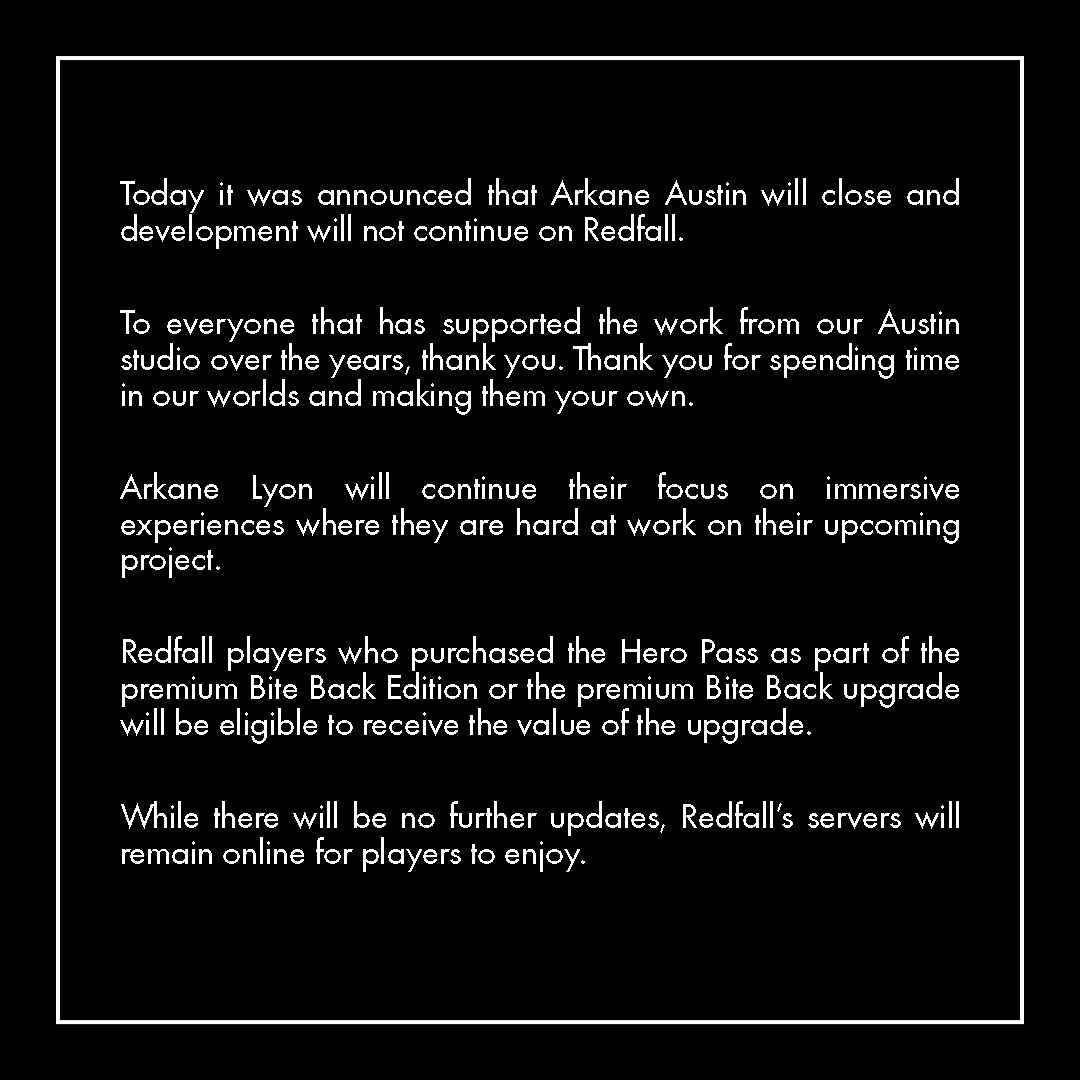 Arkane potwierdziło dzisiaj, że żywot Redfall dobiegł końca. Nie zobaczymy ani obiecanych treści, ani kolejnych aktualizacji. To także koniec Arkane Austin.