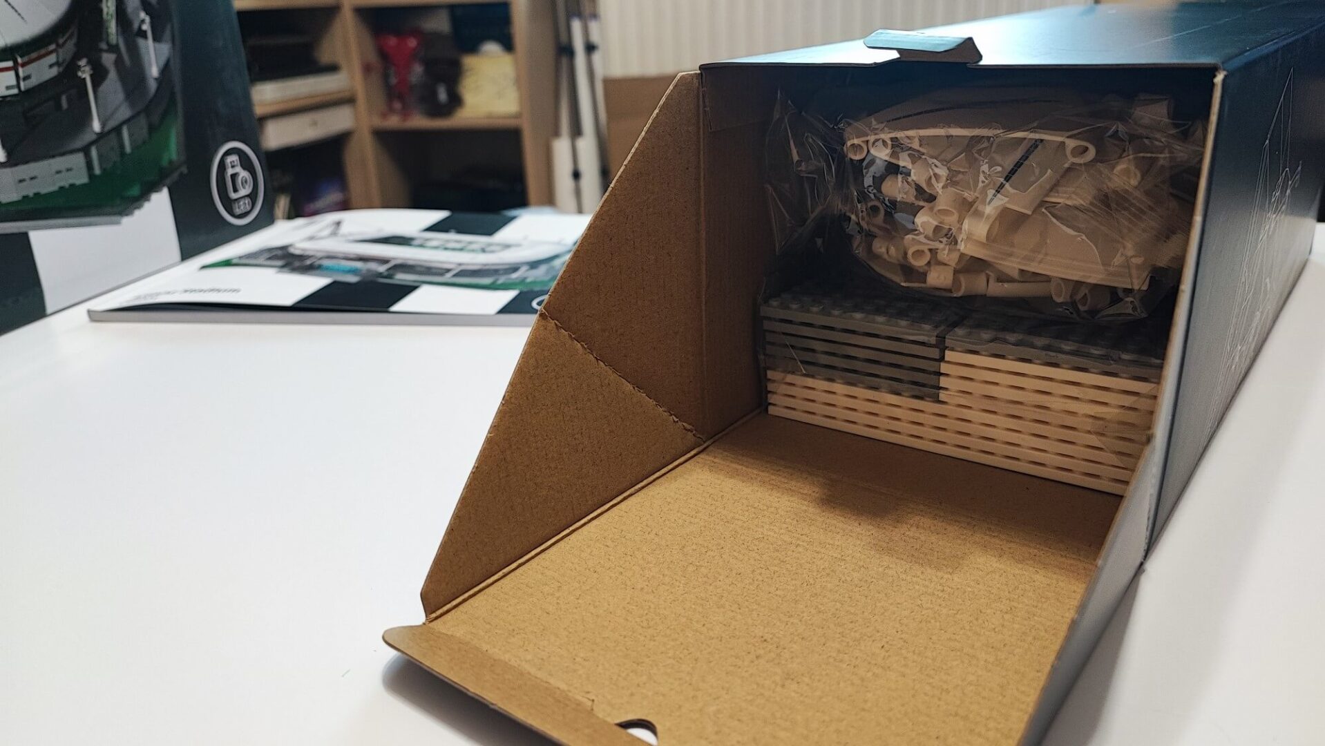 Recenzowany zestaw zapakowano w bardzo ładne pudełko, które pokryto biało-czarnymi pasami. Samo zdjęcie stadionu wykonano w technice laminatu, co tylko pokazuje nam, że mamy do czynienia z produktem klasy premium. Po uniesieniu pokrywy naszym oczom ukaże się pięć dużych czarnych pudełek, które razem tworzą techniczny obrazek Allianz Stadium. Pod największym z nich, czyli środkowym ukryto dużą obrazkową instrukcję wraz z arkuszami naklejek. Jest ich ponad sto, więc będzie wam potrzebne dużo cierpliwości oraz precyzji do ich idealnego nałożenia. Nałożymy je na bandy wokół murawy, trybuny, czy okleimy całe słupy nośne. Jeżeli chodzi o klocki z nadrukami, to znajdziemy je tylko na elementach dachu oraz płycie boiska. Co ciekawe, stadion ma jedną ruchomą trybunę, przypominającą kartoniadę oraz oświetlenie dachu wraz z osioma trybami światła zasilanymi z gniazda USB.