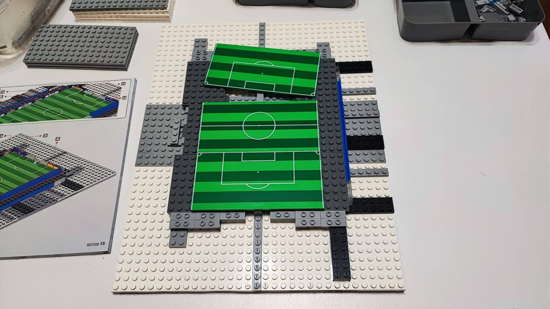 Teraz przechodzimy z pewnością do najtrudniejszej fazy konstrukcji, jaką jest pokrycie dachowe. Jak wspomniałem, wszystkie klocki składające się na dach są z nadrukami, jednak przy ich montażu musimy być bardzo ostrożni, gdyż nie ma żadnych zapasowych elementów. Sporo tutaj będzie łączenia belek pinami oraz dodawania do nich kolejnych płatów dachu. Na początek zbudujemy zadaszenie trybuny Ovest i Est. Polecam wam budować te elementy jednocześnie, gdyż są zupełnie takie same.