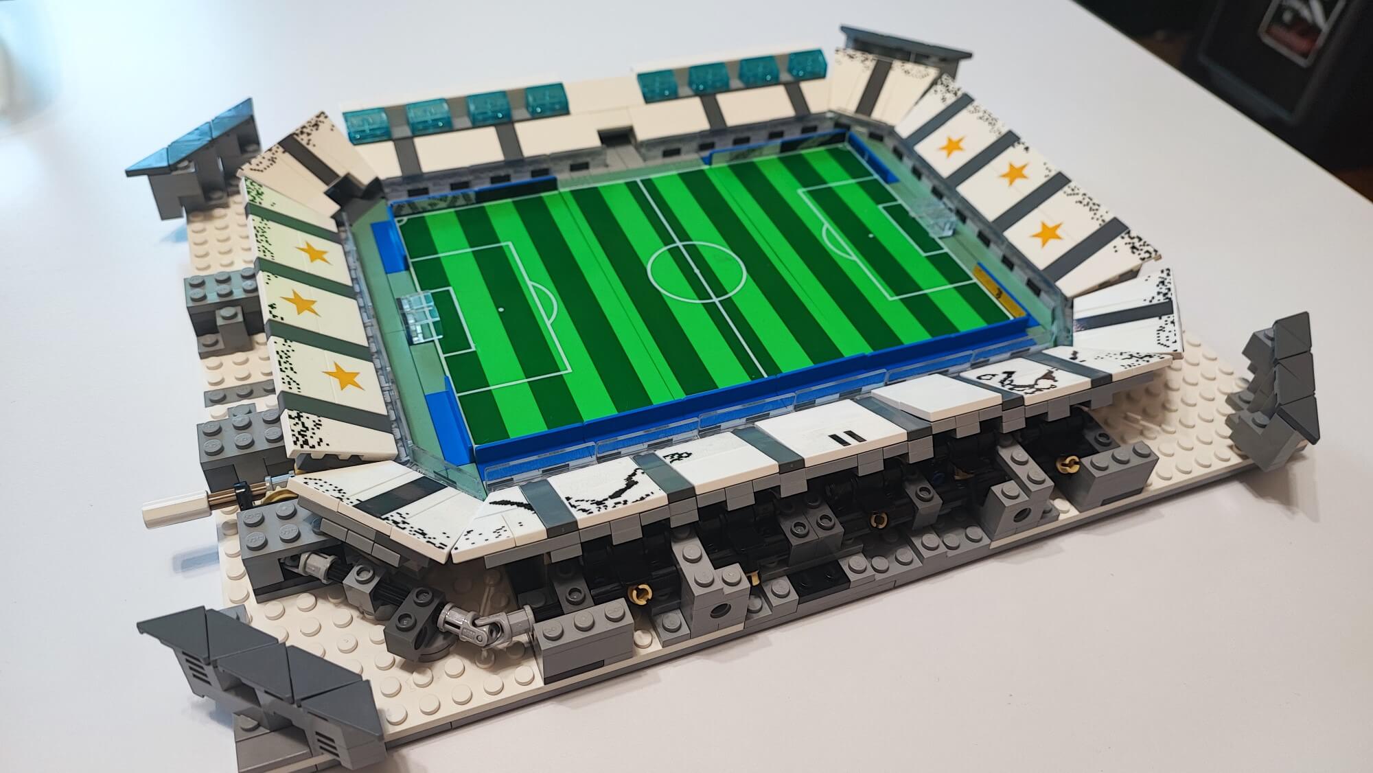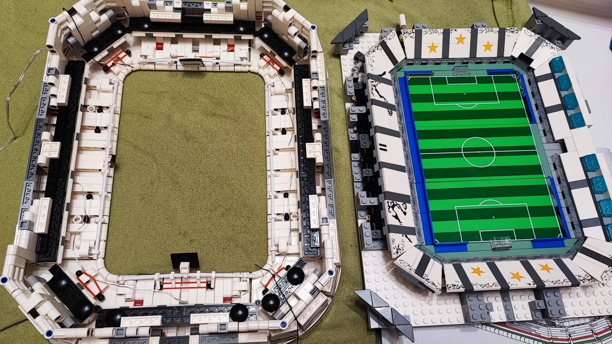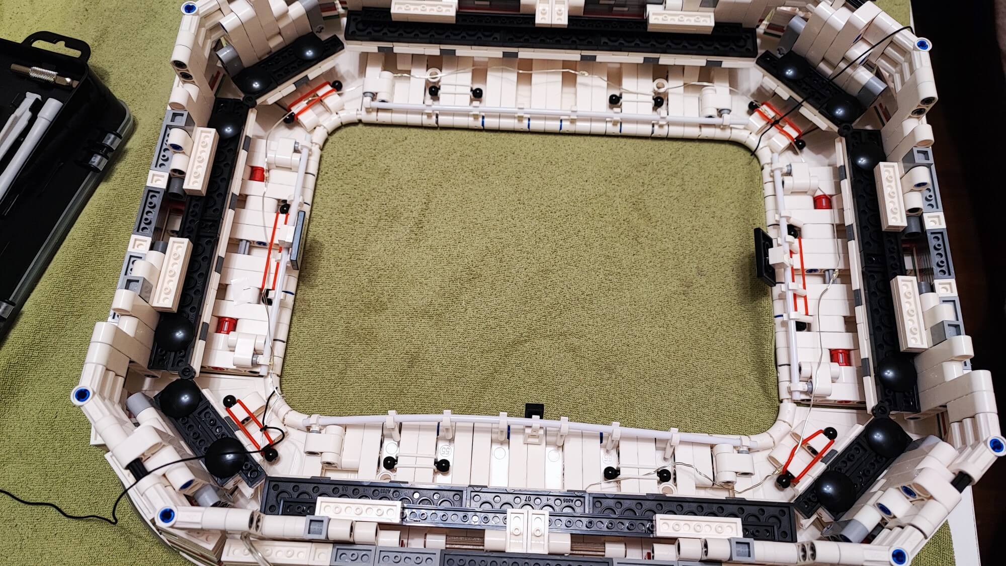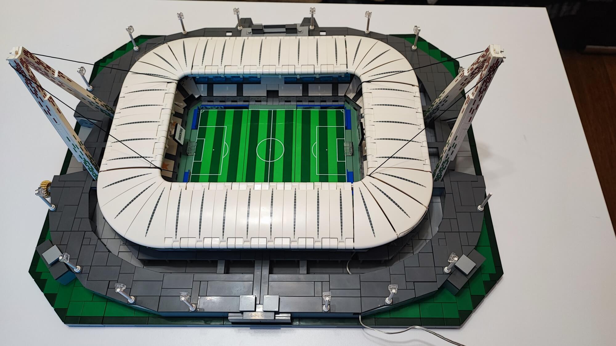 Teraz musimy wszystkie te elementy (ściany oraz dach) połączyć. Trudnym zadaniem może okazać się zadbanie, aby wszystko do siebie idealnie pasowało. Trzeba tu dużo cierpliwości oraz samozaparcia, aby żadnego elementu nie uszkodzić. Gdy nam się to uda, otrzymamy owalną konstrukcję, którą możemy w dowolnym momencie położyć na boisku oraz ściągać, aby zaprezentować wnętrze stadionu. Zbudowaną konstrukcję w kolejnym etapie należy położyć “kołami do góry“, aby zamontować oświetlenie, którym są diody na długim druciku. Przewód prowadzimy głównie pod gumkami, które zamontowaliśmy w konstrukcji dachu w trakcie jego budowania. Użycie pęsety będzie tutaj bardzo pomocne. Po zamontowaniu oświetlania pozostaje już tylko dach wraz ze ścianami położyć na zbudowanej wcześniej płycie boiska. Teraz nasz obiekt piłkarski przypomina już duży miejski stadion z prawdziwego zdarzenia.