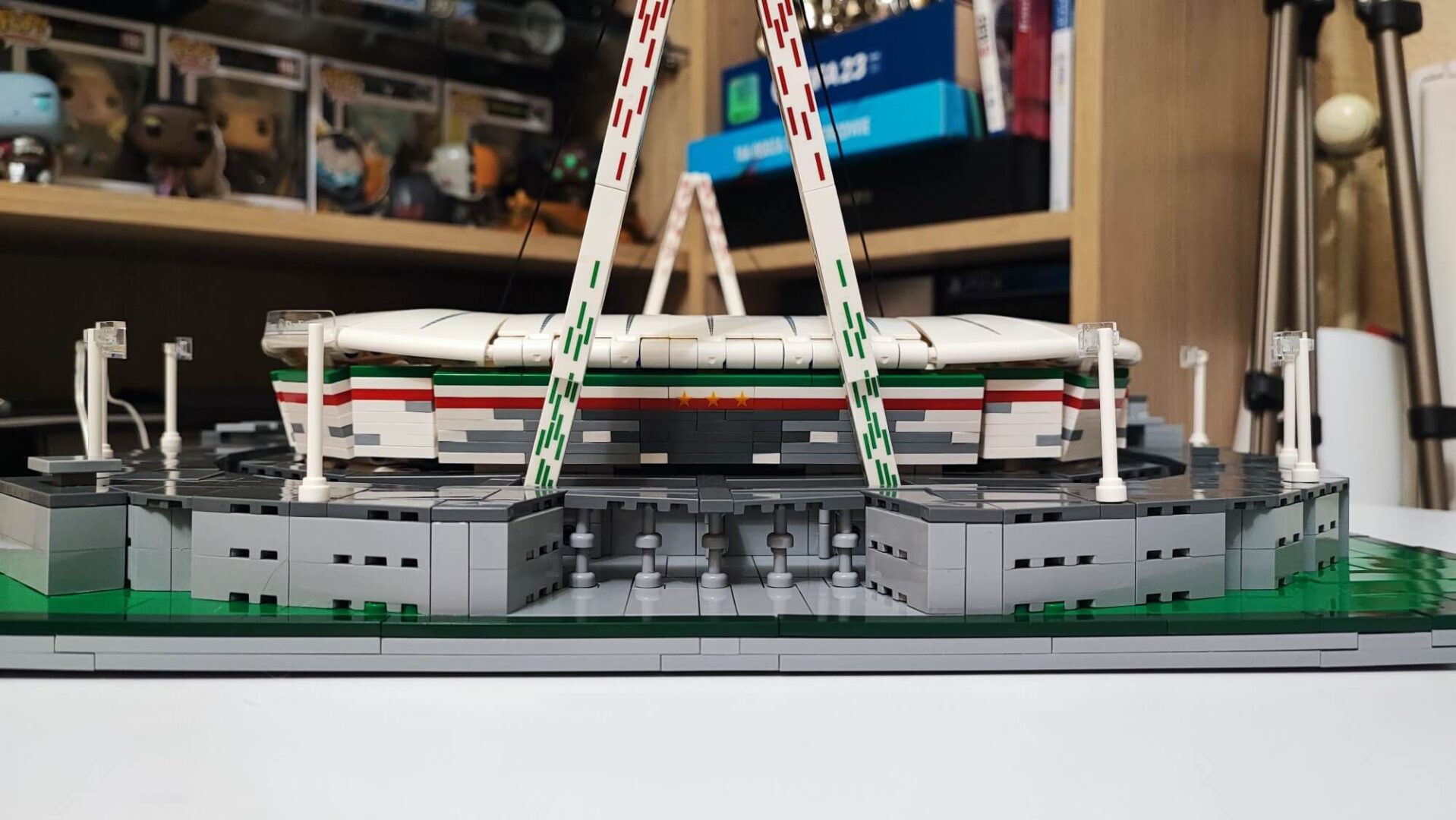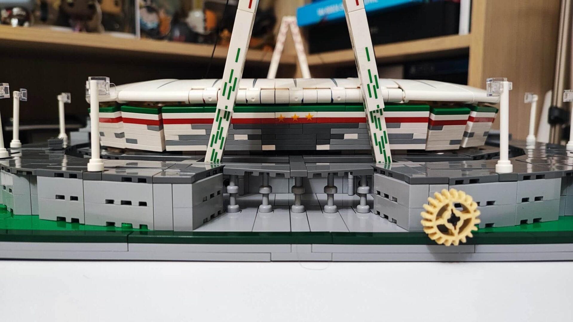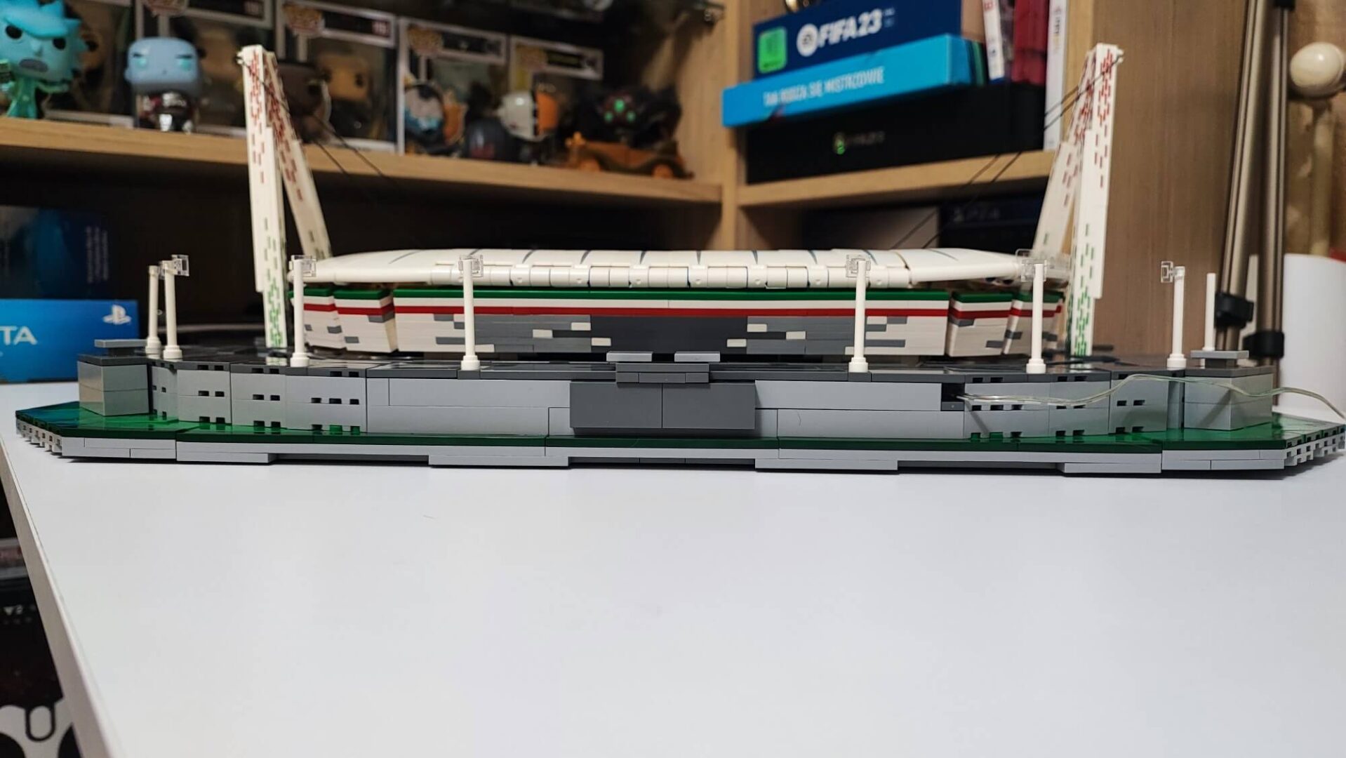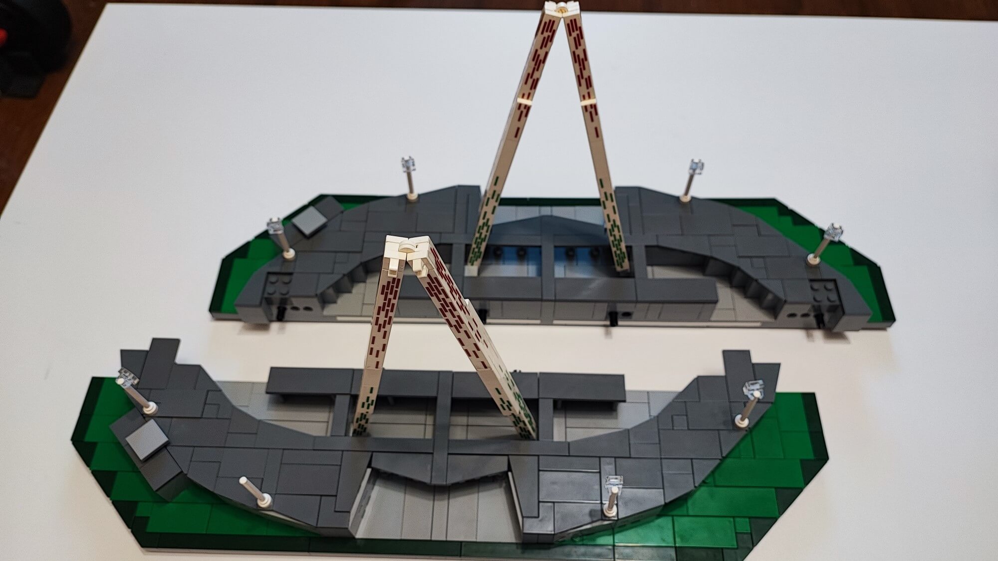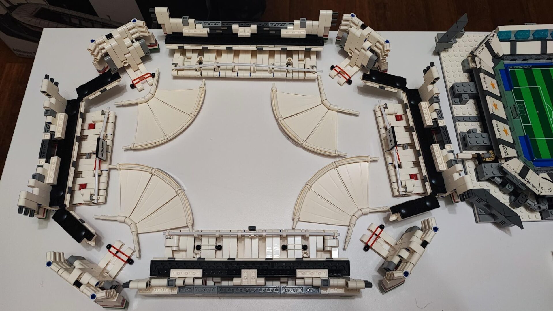 Teraz musimy wszystkie te elementy (ściany oraz dach) połączyć. Trudnym zadaniem może okazać się zadbanie, aby wszystko do siebie idealnie pasowało. Trzeba tu dużo cierpliwości oraz samozaparcia, aby żadnego elementu nie uszkodzić. Gdy nam się to uda, otrzymamy owalną konstrukcję, którą możemy w dowolnym momencie położyć na boisku oraz ściągać, aby zaprezentować wnętrze stadionu. Zbudowaną konstrukcję w kolejnym etapie należy położyć “kołami do góry“, aby zamontować oświetlenie, którym są diody na długim druciku. Przewód prowadzimy głównie pod gumkami, które zamontowaliśmy w konstrukcji dachu w trakcie jego budowania. Użycie pęsety będzie tutaj bardzo pomocne. Po zamontowaniu oświetlania pozostaje już tylko dach wraz ze ścianami położyć na zbudowanej wcześniej płycie boiska. Teraz nasz obiekt piłkarski przypomina już duży miejski stadion z prawdziwego zdarzenia.
