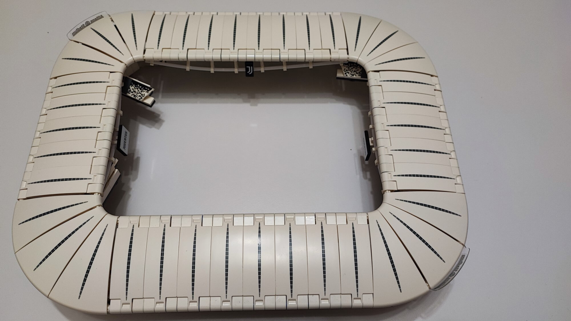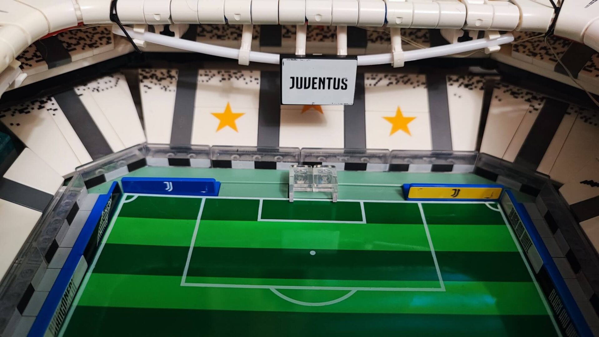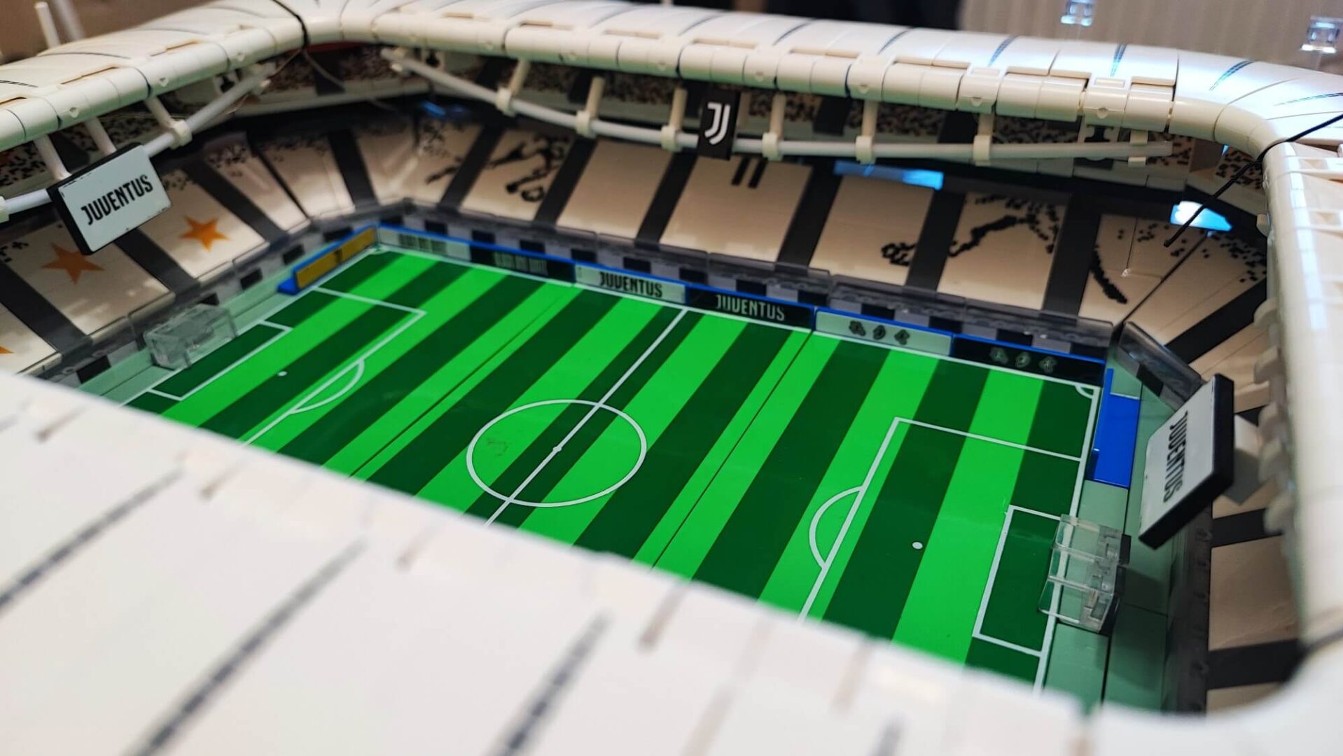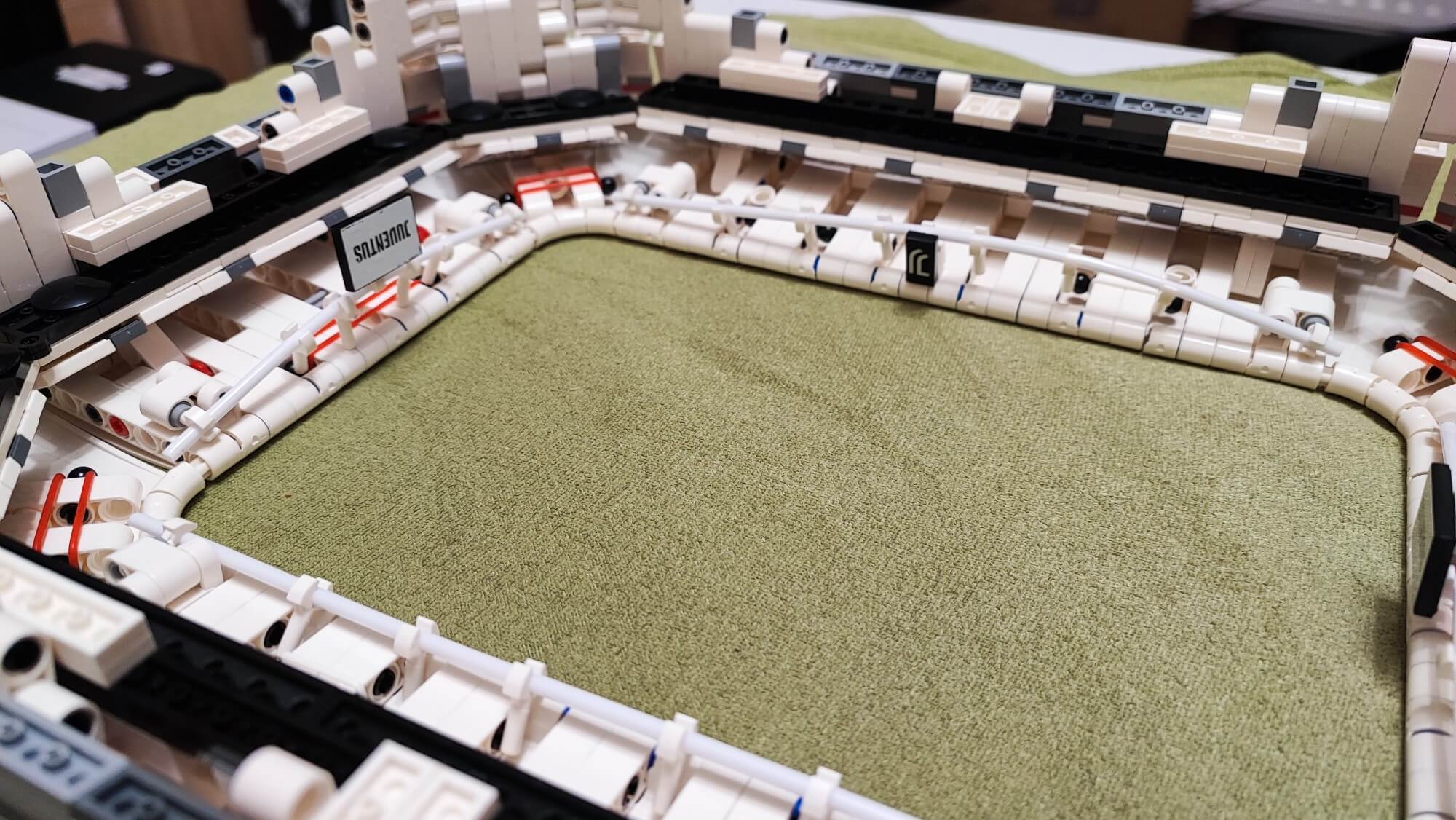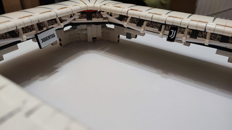 Dookoła murawy umieszczamy niebieskie bandy, a każdy klocek oklejamy wymaganą naklejką. Są to głównie napisy Juventus, Black and White oraz przydomek klubu — Bianconeri. Na bandach przy jednej z bramek umieścimy naklejki z napisem Juventus official product. Dzięki temu odwiedzający nas znajomi będą wiedzieli, że to oficjalny produkt na licencji włoskiego klubu. Za bandami wokół murawy stadionu zbudujemy z przezroczystych klocków osłonę przypominająca siatkę bezpieczeństwa. Te klocki również musimy okleić naklejkami z biało-czarnymi prostokątami.