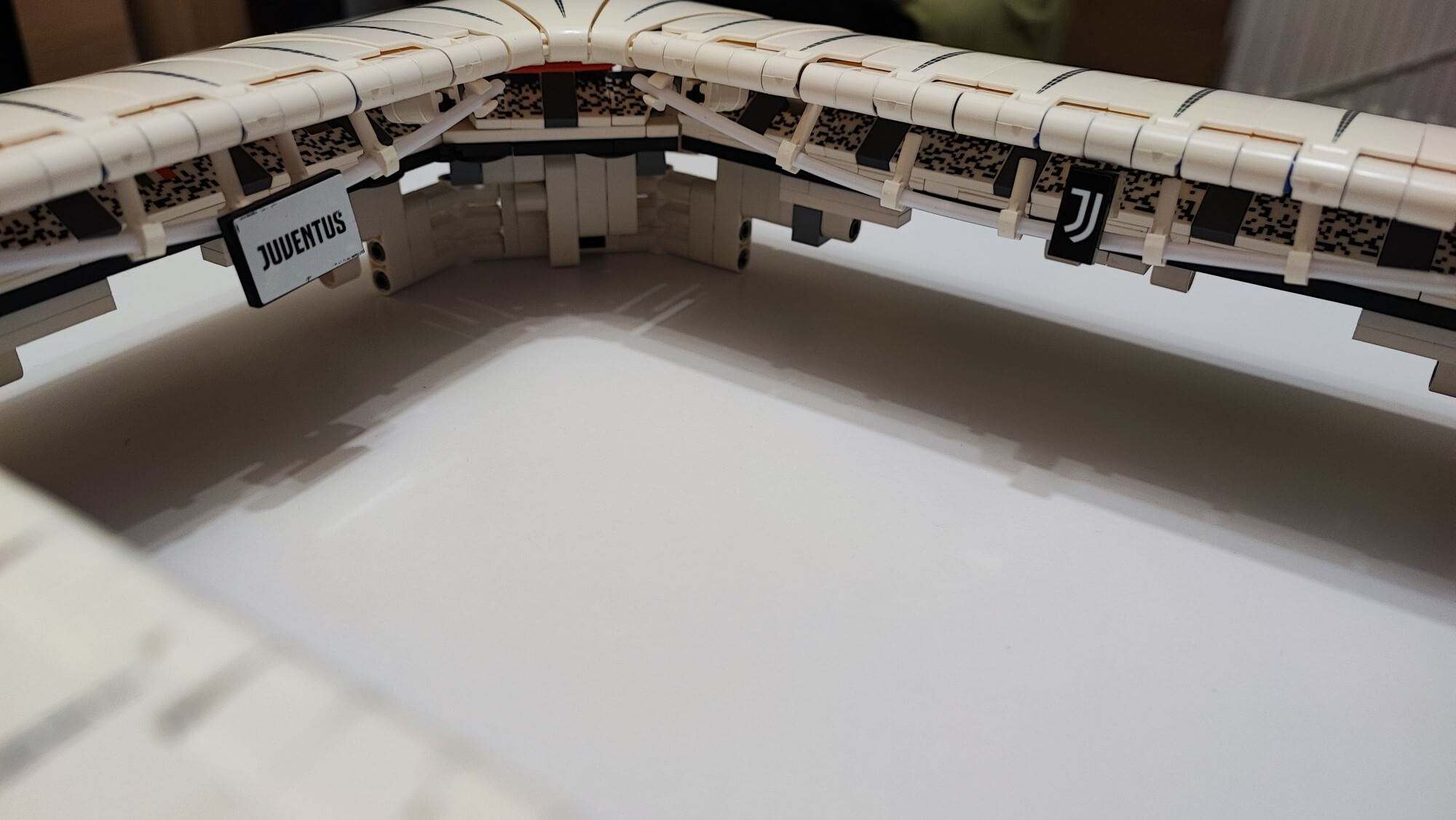 Z klocków umieszczonych w drugim pudełku zbudujemy trybuny. Tutaj muszę bardzo pochwalić firmę CaDA, gdyż naklejki, które trafią na klocki od trybun niemal perfekcyjnie odzwierciedlają ułożenie krzesełek na Allianz Stadium. Oczywiście najbardziej widowiskowa jest w telewizji jest Tribuna Ovest, uważana za trybunę główną. W północnej części znajdziemy trybunę ultrasów – Curva Nord, najbardziej zagorzałych kibiców odpowiedzialnych za doping. W południowej części jest jeszcze Curva Sud, a na wschodzie Tribuna Est z największą liczbą kibiców oraz lożami VIP-owskimi. Warto dodać, że Tribuna Ovest jest ruchoma dzięki specjalnemu systemowi, który porusza płaskie klocki. Efekt przypomina kartoniadę i z pewnością nieraz zaskoczy waszych znajomych. Na oficjalnej stronie Juventusu Turyn możecie wybrać się na wirtualną wycieczkę, aby dokładnie przyjrzeć się tym fantastycznym trybunom. W tym momencie mamy już gotowe boisko wraz z trybunami oraz lożami VIP. Efekt stadionu z klocków CaDa jest niesamowity i przypomina na ten moment mały miejski obiekt piłkarski.