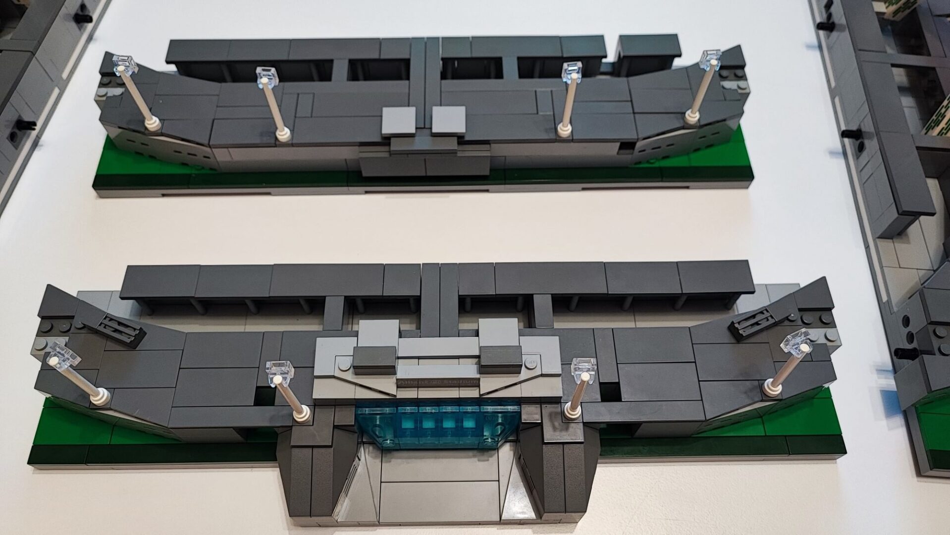Natomiast po stronie północnej oraz południowej oprócz makiety budynków zbudujemy też dwa słupy, które za pomocą czarnych nitek mają trzymać dach. Te nitki to oczywiście tylko imitacja prawdziwych lin, robią w tym zestawie za element ozdobny. Słupy oklejamy dookoła wieloma naklejkami z biało-czerwono-zielonymi paskami, które symbolizują włoską flagę. Łączenie płyt z makietami budynków jest znacznie prostsze niż łączenie dachu i ścian. Każda z tych makiet ma tylko dwa czarne piny, które wsuwamy w odpowiednie miejsce w makiecie z murawą oraz trybunami.