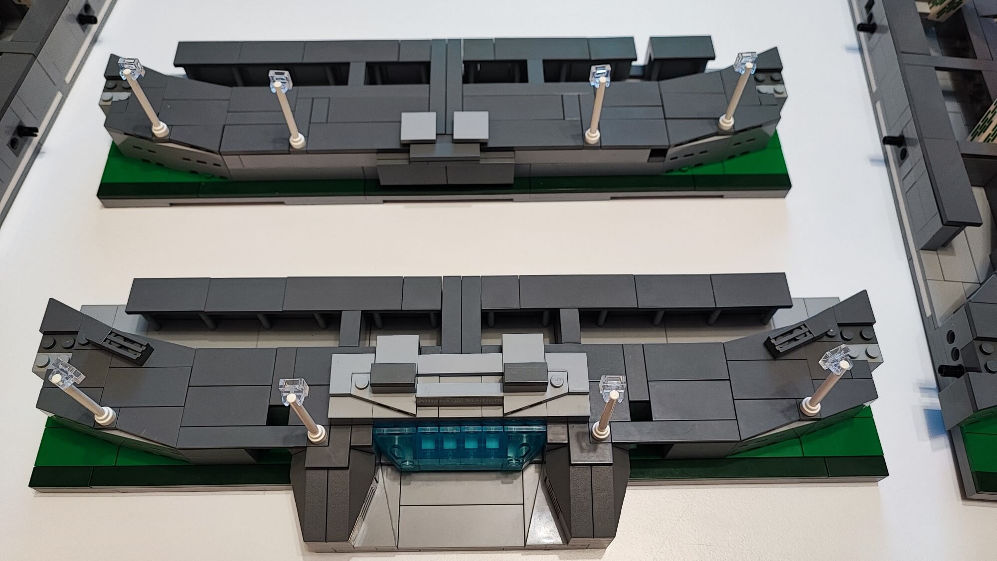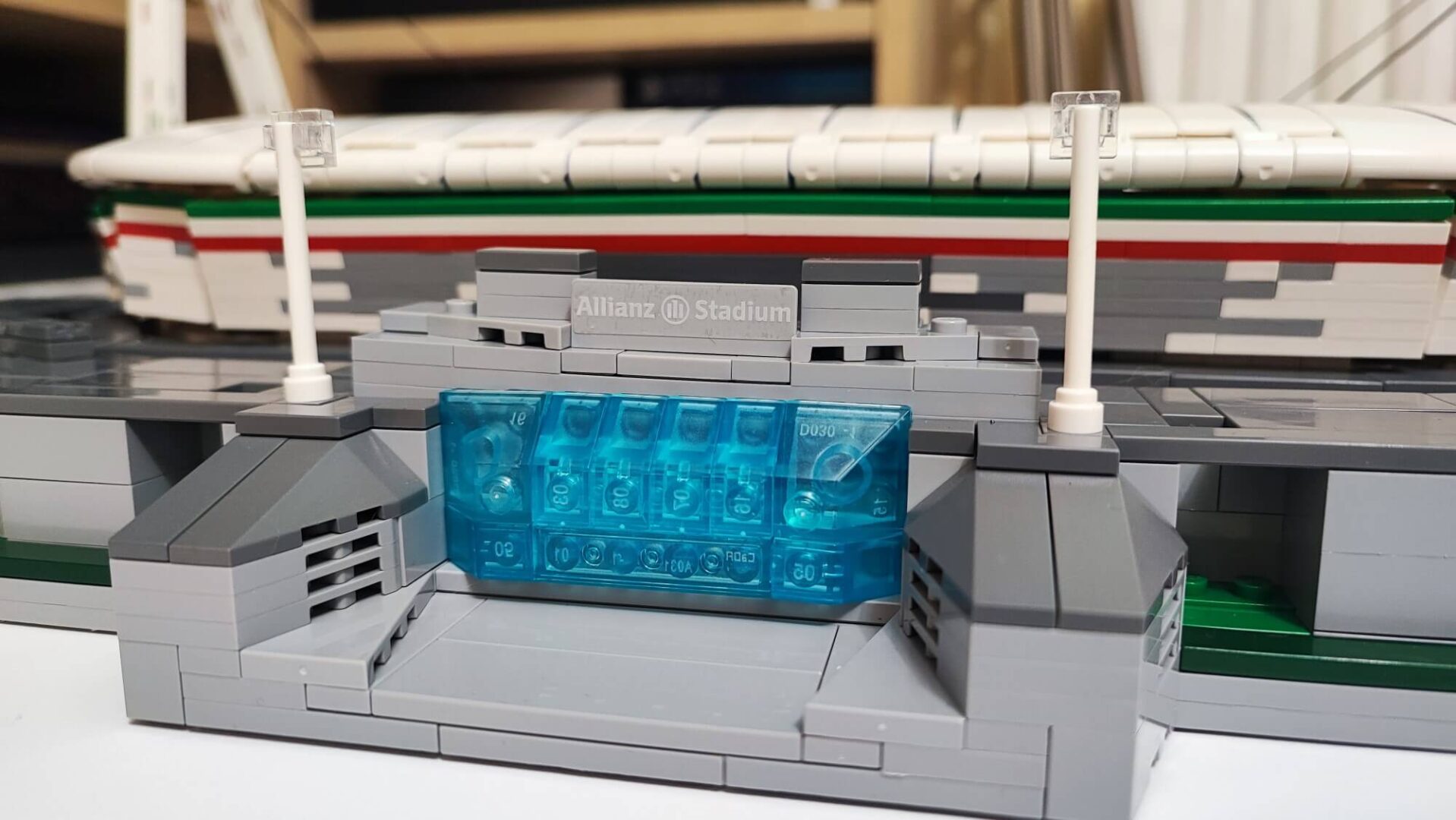 To, co najważniejsze dla kibiców oraz piłkarzy mamy już zbudowane. Jednak jesteśmy dopiero w połowie budowania całego zestawu CaDA Allianz Stadium C66021W. Jak to możliwe? Sporą część tej makiety stanowią budynki dookoła stadionu wraz ze słupami trzymającymi dach od strony północnej oraz południowej. Wszystkie te elementy powstają z dużych i małych normalnych klocków, więc nawet najmłodsi fani piłki nożnej bez problemu poradzą sobie z tym wyzwaniem. Po stronie zachodniej zbudujemy wejście główne na stadion. Na wschodzie konstrukcja jest niemal identyczna, z tą różnicą, że tam już żadnego wejścia nie ma. Ukryto za to przesmyk na kabel od zasilania oświetlenia.