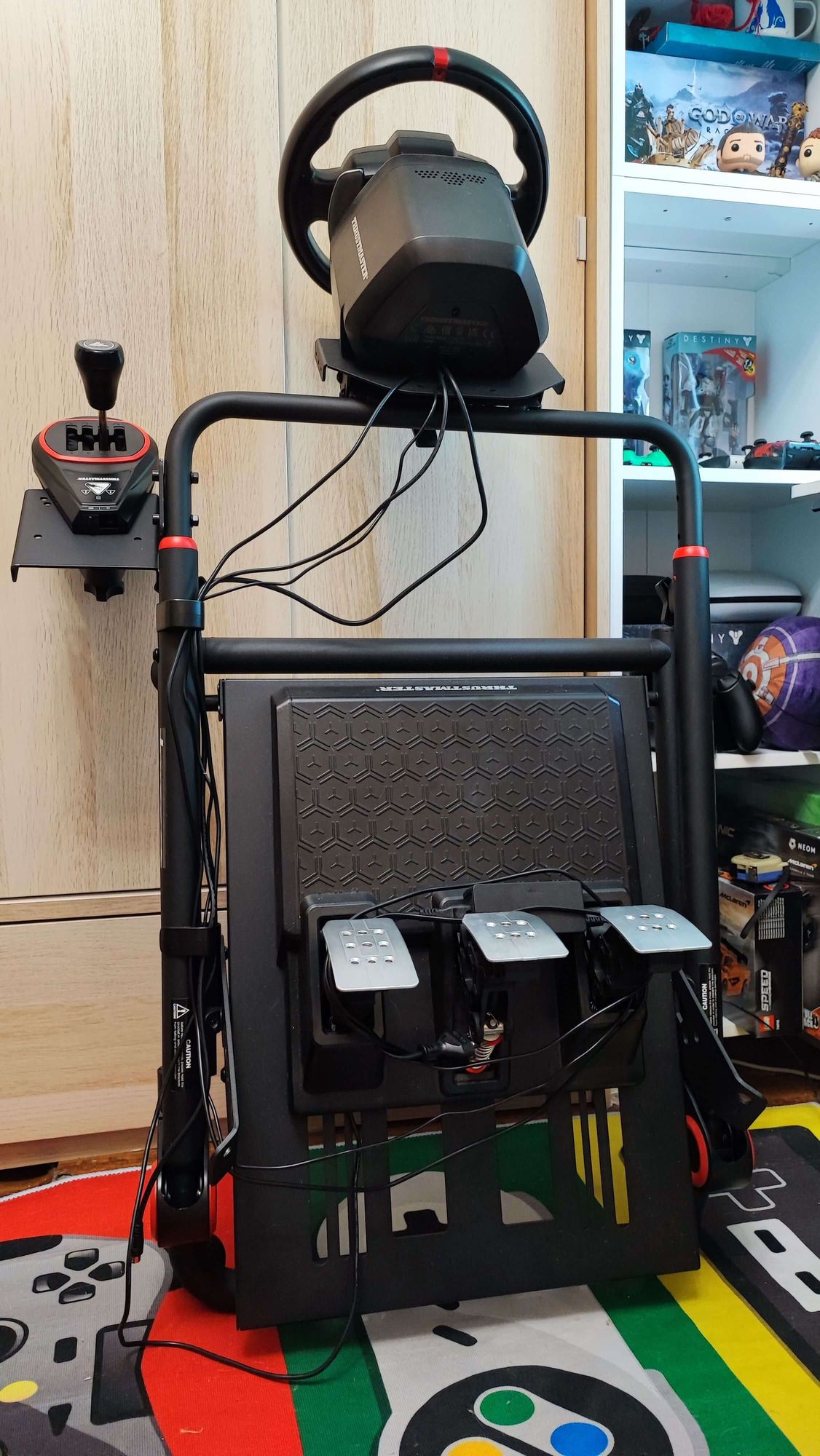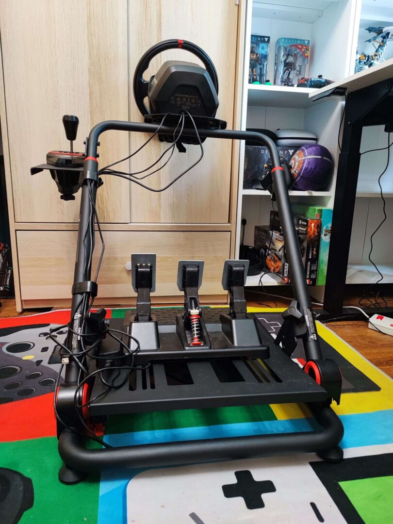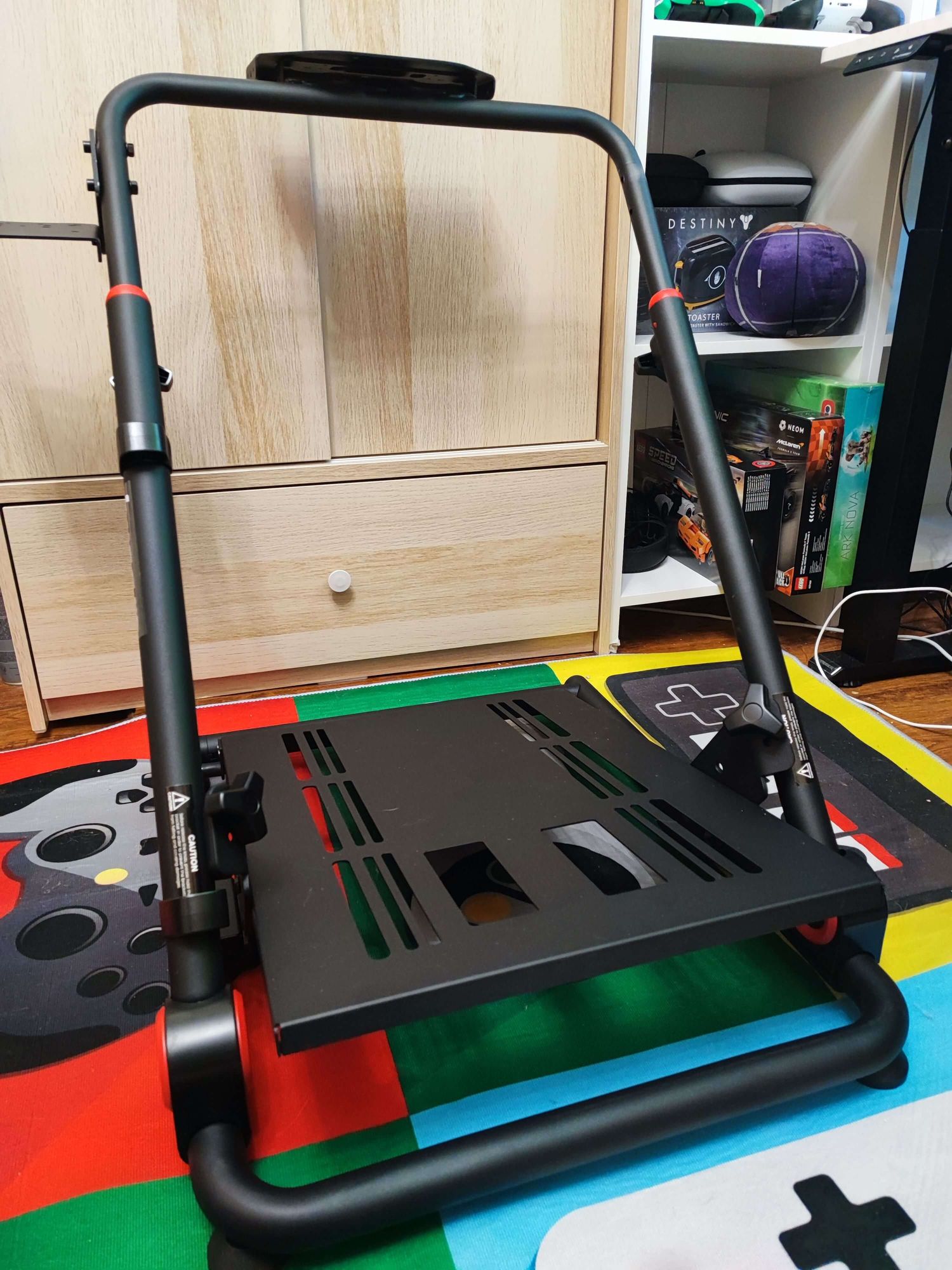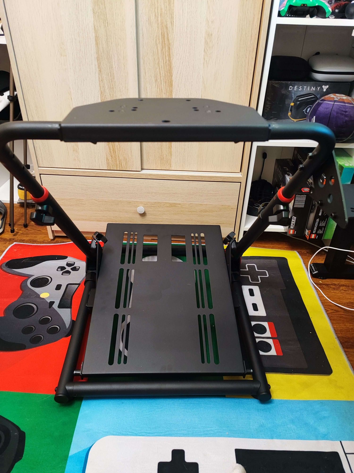 Wykonanie stojaka ze stali zamiast z aluminium ma oczywiście swoje konsekwencje, ale też i zalety. Zaletą jest oczywiście duża wytrzymałość konstrukcji oraz stabilność, która nie zawiedzie nas nawet podczas intensywnego driftowania. Konsekwencje, to oczywiście duża waga zestawu, dziecko stojaka z zamontowanym wyposażeniem nie przeniesie. Sam muszę użyć trochę siły, aby tego dokonać. Jednak jest to zdecydowanie wygodniejszy proces niż wyciąganie za każdym razem kierownicy z szafy i podłączanie tych wszystkich kabli na nowo. W przypadku złożenia stojaka i odstawienia na bok wystarczy po prostu dwie śruby odkręcić (przypominające „motylka”). Złożony zestaw bez trudu zmieści się też pod łóżkiem lub za szafą.