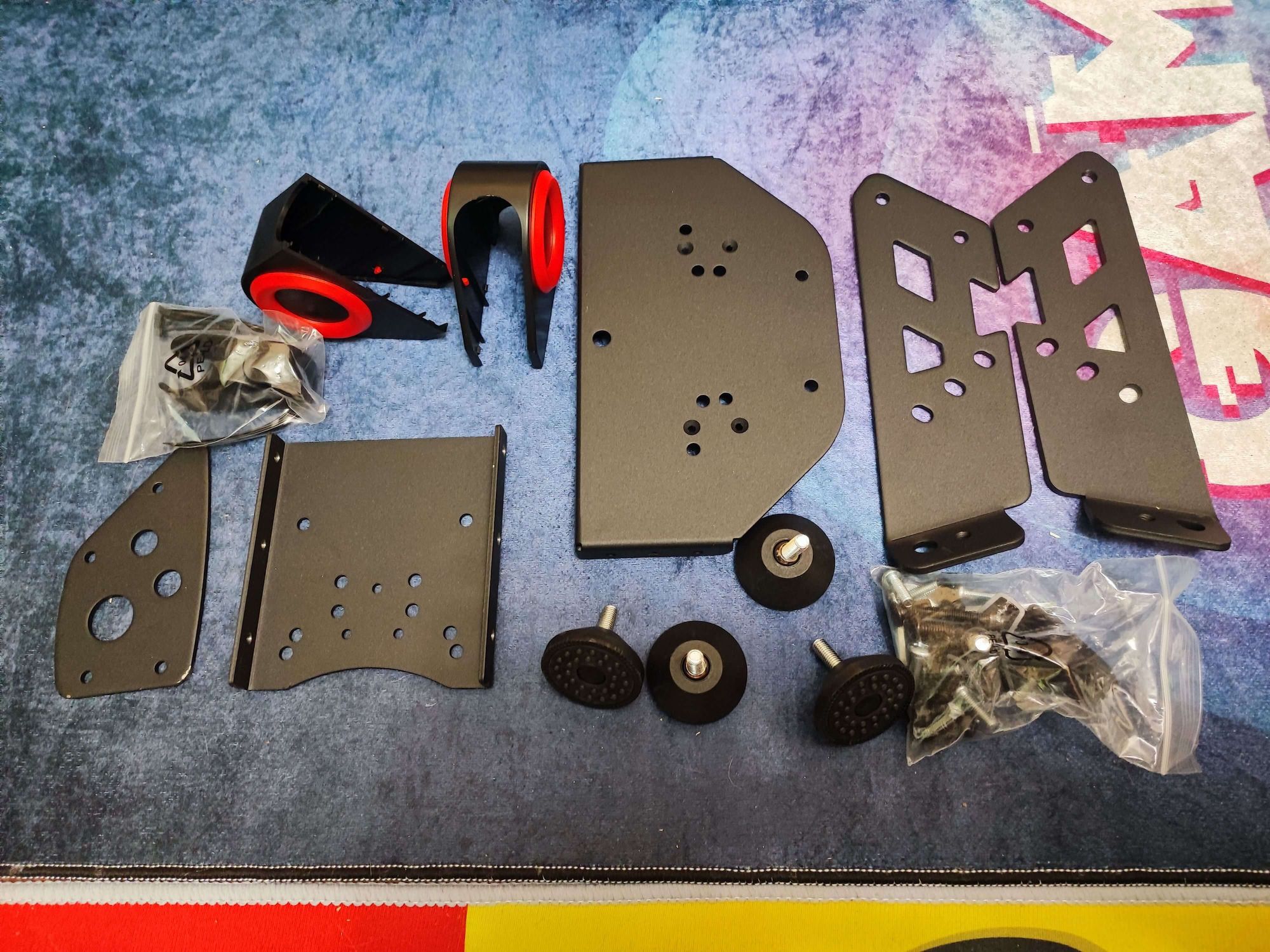 Na tych wspornikach od ramion mamy też trzy otwory, które wyznaczają kąt ustawiani podstawy od pedałów. Możemy je zamocować pod kątem 7, 11 i 15 stopni. Kolejnym etapem jest złożenie małej półki pod kierownice, tutaj także mamy trzy kąty regulacji: -15, 0 i +15 stopni. Ostatnim etapem montażowym jest przykręcenie półki pod shifter, którą według komfortu możemy przymocować po lewej bądź prawej stronie stojaka. W zestawie znajdziemy też kilka akcesoriów, mi.in. dwa plastikowe elementy na ramę do prowadzenia kabli, opaski zaciskowe (trytytki) oraz śruby do montażu kierownicy z pedałami. Co ciekawe pedały T3PM z zestawu Thrustmaster T248 do PS5 pasowały idealnie do otworów w podstawie stojaka. Dołączone śruby również, za to należy się duży plus dla producenta z Poznania. Kierownice oraz shifter przykręciłem do stojaka za pomocą dołączonego imadła. Całkowity montaż stojaka zajął mi jakieś 30-40 minut.