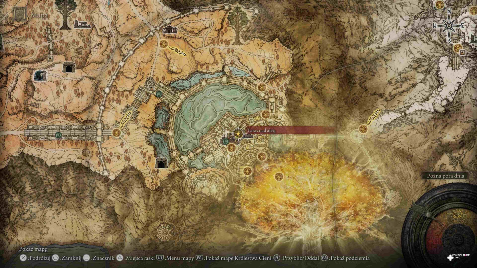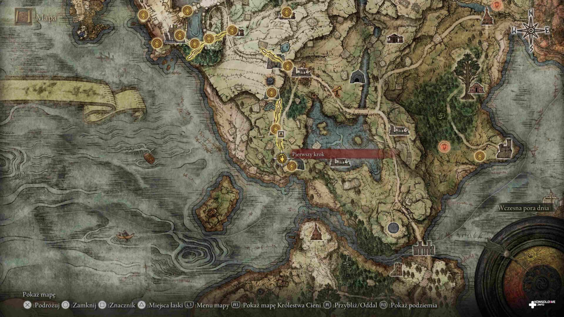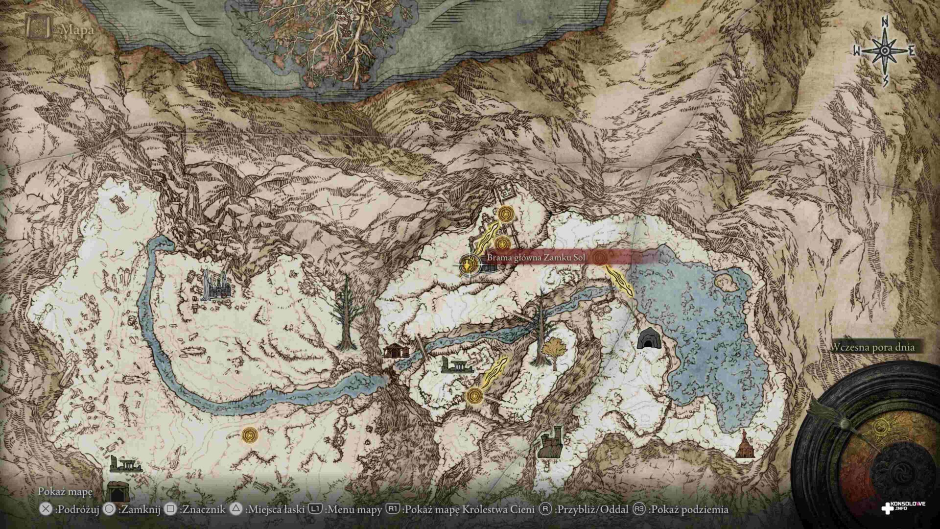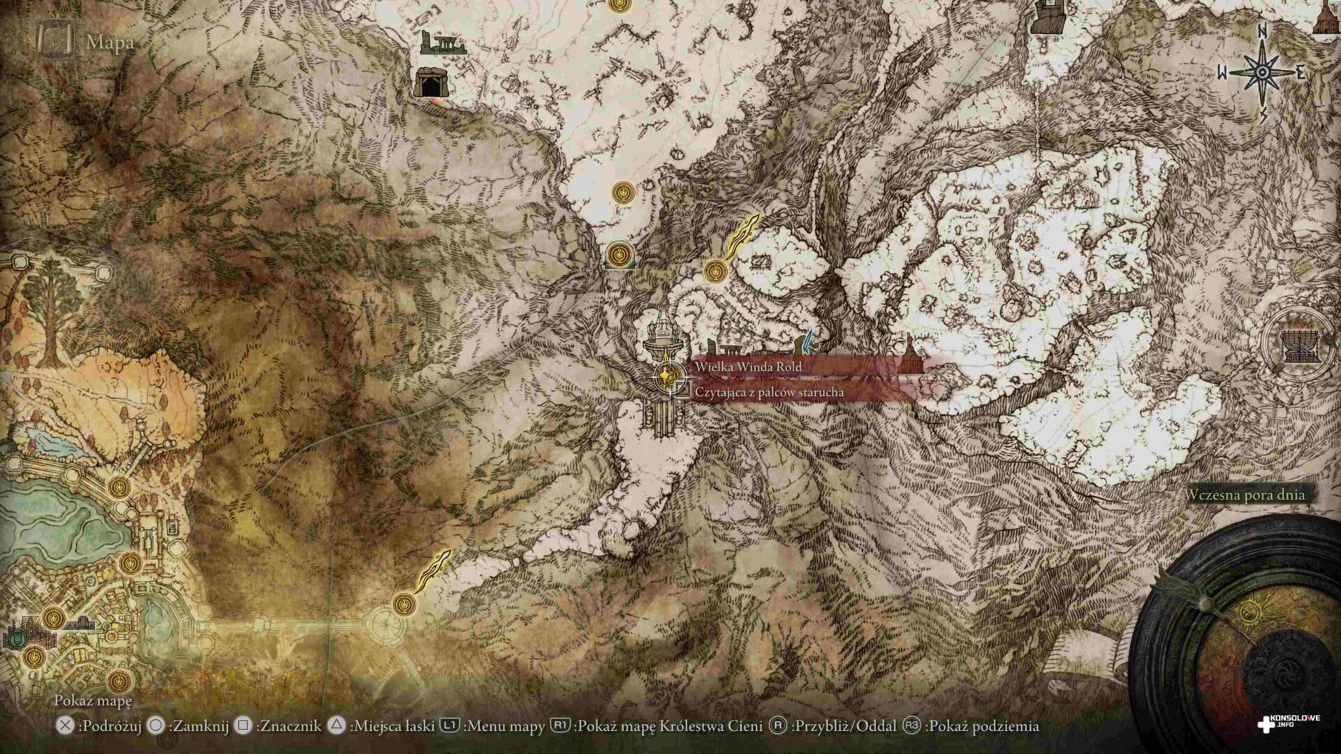 Po dotarciu do Leyndell możemy powinniśmy oczywiście odblokować wszystkie miejsca łaski, które mijamy po drodze. Jednym z nich będzie Taras nad aleją. Kiedy je aktywujemy, będziemy mieć dość przydatny punkt odniesienia dla dalszego przemierzania Leyndell. Zejdźmy więc po pobliskich schodach, a następnie prosto w stronę wielkiego posągu smoka. Możemy po nim wejść i zdecydowanie powinniśmy to zrobić, chcąc zdobyć medalion. Wchodząc po tym posągu będziemy mogli znaleźć kolejne miejsce łaski – Zachodnie mury obronne stolicy. Idąc dalej, zobaczymy wielkie korzenie oplatające majestatyczną budowlę – to nasz cel. Wchodząc po tej roślinie (i uważając oczywiście na przeciwników), wejdziemy na dziedziniec, z którego natomiast przejdziemy przez wielkie drzwi i zmierzymy się z kolejnym bossem – Morgottem. Teraz możemy iść do Wielkiej Windy Rold i przenieść się na Szczyty Gór Olbrzymów. Tu powinniśmy kierować się w stronę wielkiego zamku (widocznego też mapie).