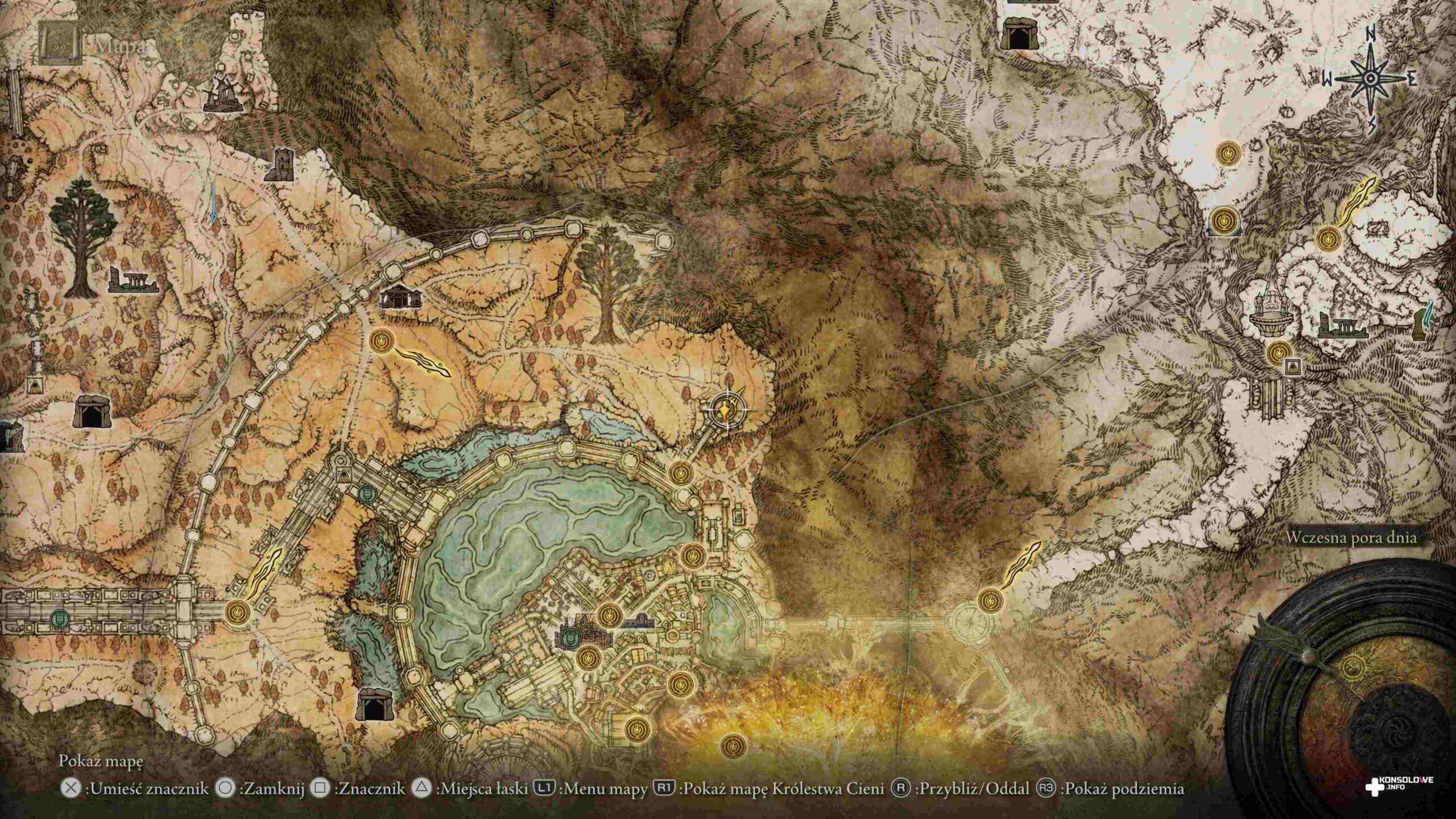 Po dotarciu do Leyndell możemy powinniśmy oczywiście odblokować wszystkie miejsca łaski, które mijamy po drodze. Jednym z nich będzie Taras nad aleją. Kiedy je aktywujemy, będziemy mieć dość przydatny punkt odniesienia dla dalszego przemierzania Leyndell. Zejdźmy więc po pobliskich schodach, a następnie prosto w stronę wielkiego posągu smoka. Możemy po nim wejść i zdecydowanie powinniśmy to zrobić, chcąc zdobyć medalion. Wchodząc po tym posągu będziemy mogli znaleźć kolejne miejsce łaski – Zachodnie mury obronne stolicy. Idąc dalej, zobaczymy wielkie korzenie oplatające majestatyczną budowlę – to nasz cel. Wchodząc po tej roślinie (i uważając oczywiście na przeciwników), wejdziemy na dziedziniec, z którego natomiast przejdziemy przez wielkie drzwi i zmierzymy się z kolejnym bossem – Morgottem. Teraz możemy iść do Wielkiej Windy Rold i przenieść się na Szczyty Gór Olbrzymów. Tu powinniśmy kierować się w stronę wielkiego zamku (widocznego też mapie).