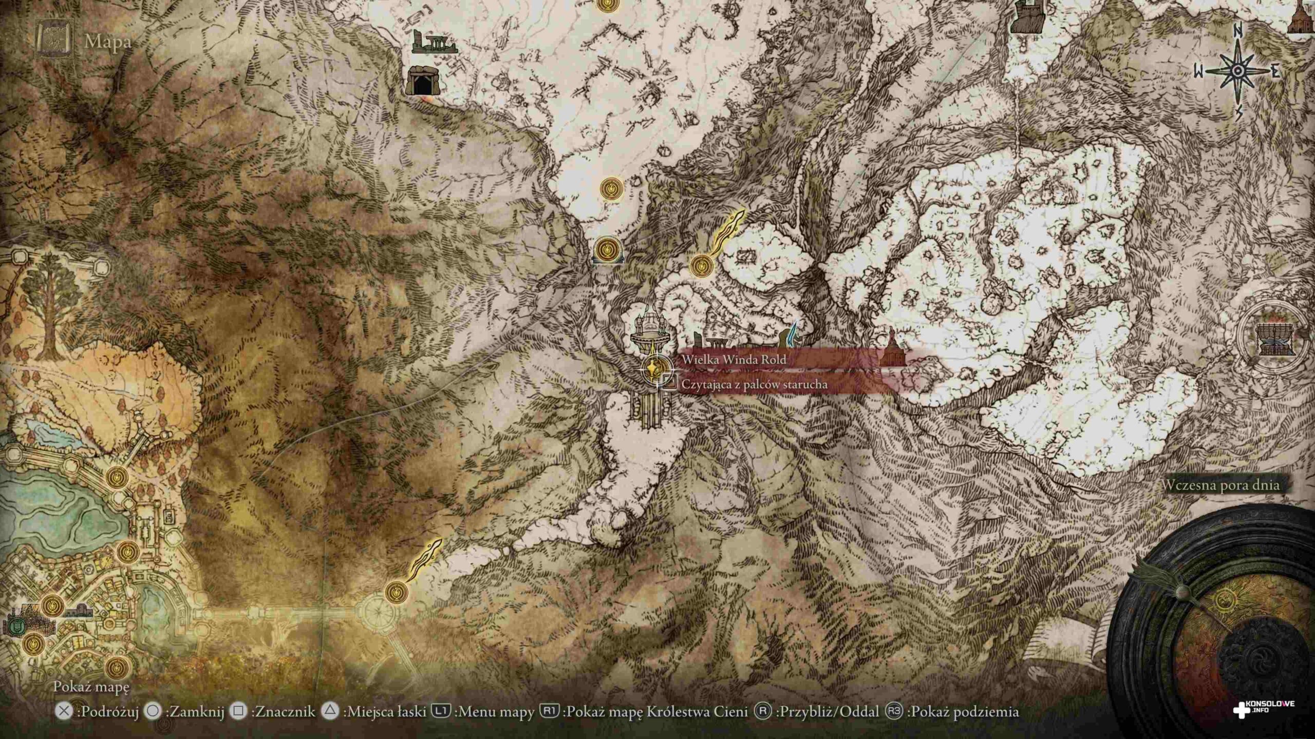 Teraz możemy skorzystać z Wielkiej Windy Rold, ale pamiętajcie, żeby krzyżakiem wybrać opcję skorzystania z sekretnego medalionu. Przeniesie to nas do podobnej, aczkolwiek innej śnieżnej lokacji. Tu powinniśmy kierować się w miejsce zaznaczone na mapie i zgładzić atakującego nas najeźdźcę. Jeżeli uda się nam go załatwić, to aktywujemy portal. Skorzystamy z niego, aby przenieść się do Pałacu Mohgwynów. Znalezienie potrtalu powinien Wam ułatwić powyższy film.