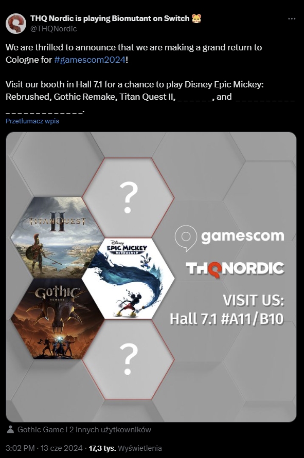To bynajmniej nie jedyne gry od PLAION Polska, które będą dostępne na targach Gamescom. Jak bowiem informuje wspomniana firma, będzie można zagrać jeszcze w dwie produkcje od THQ Nordic. Szczegóły nie są jeszcze znane, ale pewne jest, że będą one ogłoszone na THQ Nordic Digital Showcase. Jedyną podpowiedzią co do tych tytułów jest ich liczba znaków i słów składających się na te nazwy. Pierwsza nieogłoszona gra to sześcioliterowa produkcja. Natomiast druga składa się z pięciu słów i 23 liter. Prezentacja odbędzie się już 2 sierpnia 2024 roku o 21:00.