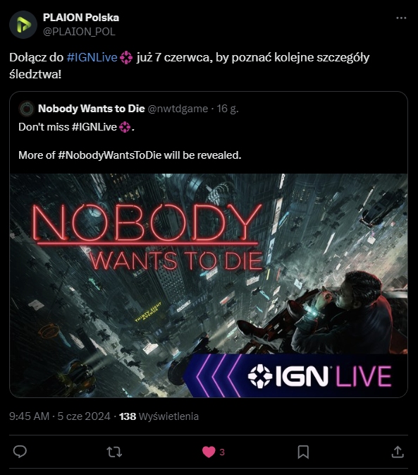 Jedną z najbardziej interesująco zapowiadających się gier jest bez wątpienia Nobody Wants to Die. Produkcja ta została zapowiedziana w marcu tego roku, o czym informowaliśmy w odpowiednim newsie. Zabierze Was do niego ten odnośnik. Natomiast dziś w mediach społecznościowych polski wydawca, PLAION Polska, udostępnił poniższy wpis: