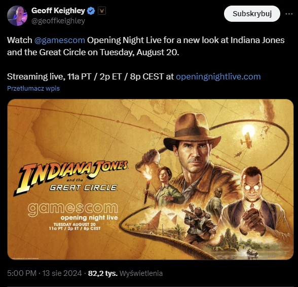 Indiana Jones dostanie za kilka miesięcy nową grę. Jeśli jesteście spragnieni nowych materiałów z kolejnych przygód znanego archeologa, to mam dla Was dobrą wiadomość. Mianowicie już za tydzień, podczas nocy otwarcia targów Gamescom, ukaże się kolejny film promujący Wielki Krąg. Zapowiedział to prowadzący tę noc dziennikarz, Geoff Keighley. Niżej możecie przyjrzeć się pełnej treści tego obwieszczenia. Noc otwarcia rozpoczyna się już w najbliższy wtorek, 20 sierpnia, o 20:00.