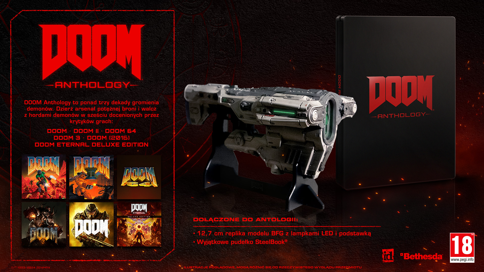 Na QuakeConie ujawniono też DOOM Anthology. Nowa fizyczna edycja zawierająca gry DOOM (1993), DOOM II, DOOM 64, DOOM 3, DOOM (2016) i DOOM Eternal Deluxe Edition. Do tego unikatowe pudełko typu SteelBook oraz prawie 13-centymetrową replikę BFG z LED-ami i podstawką. To więc iście piekielna kolekcja. DOOM Anthology kupisz od 22 października 2024 r., na Xbox One, Xbox Series X|S, PlayStation 4, PlayStation 5, Nintendo Switch i PC.