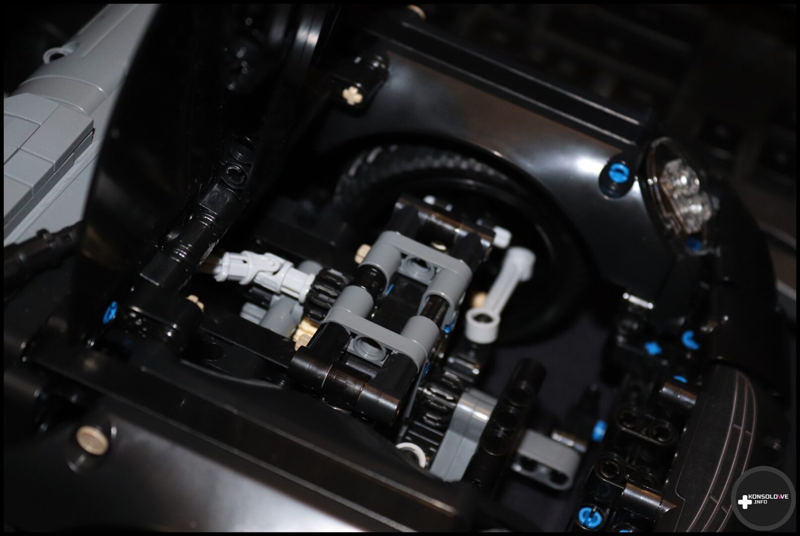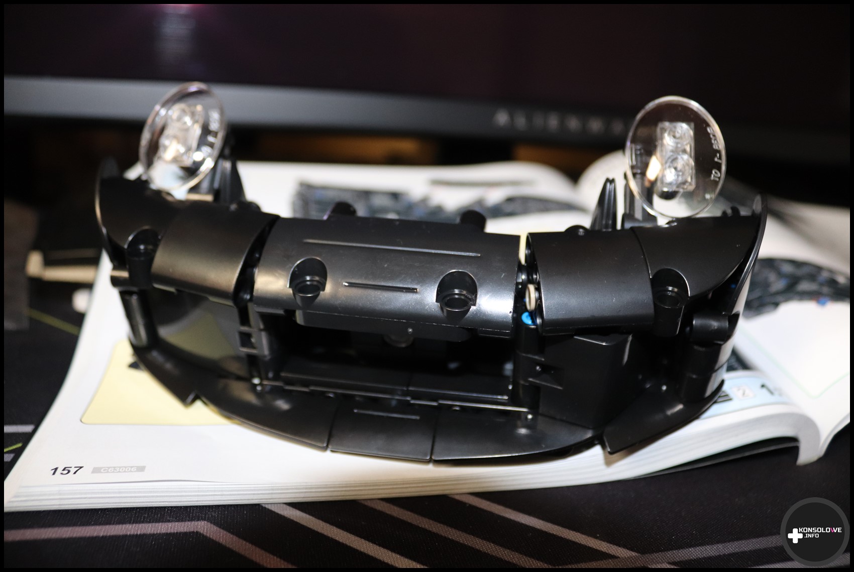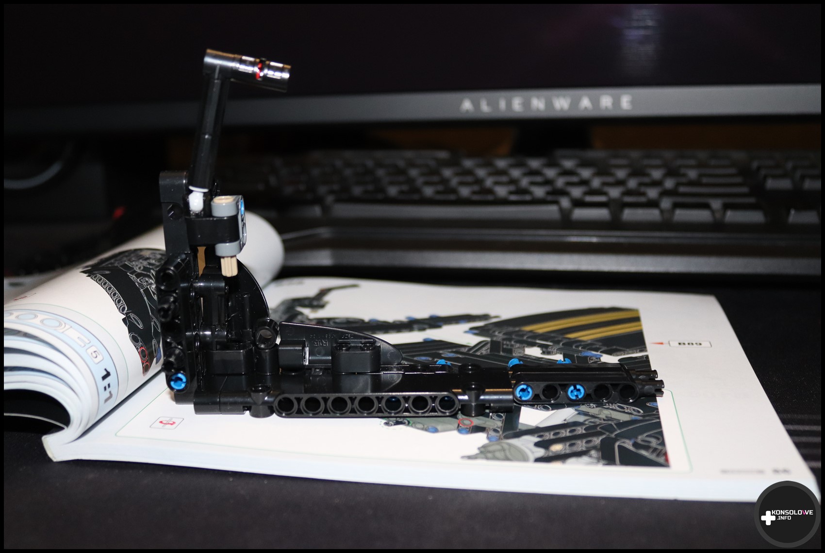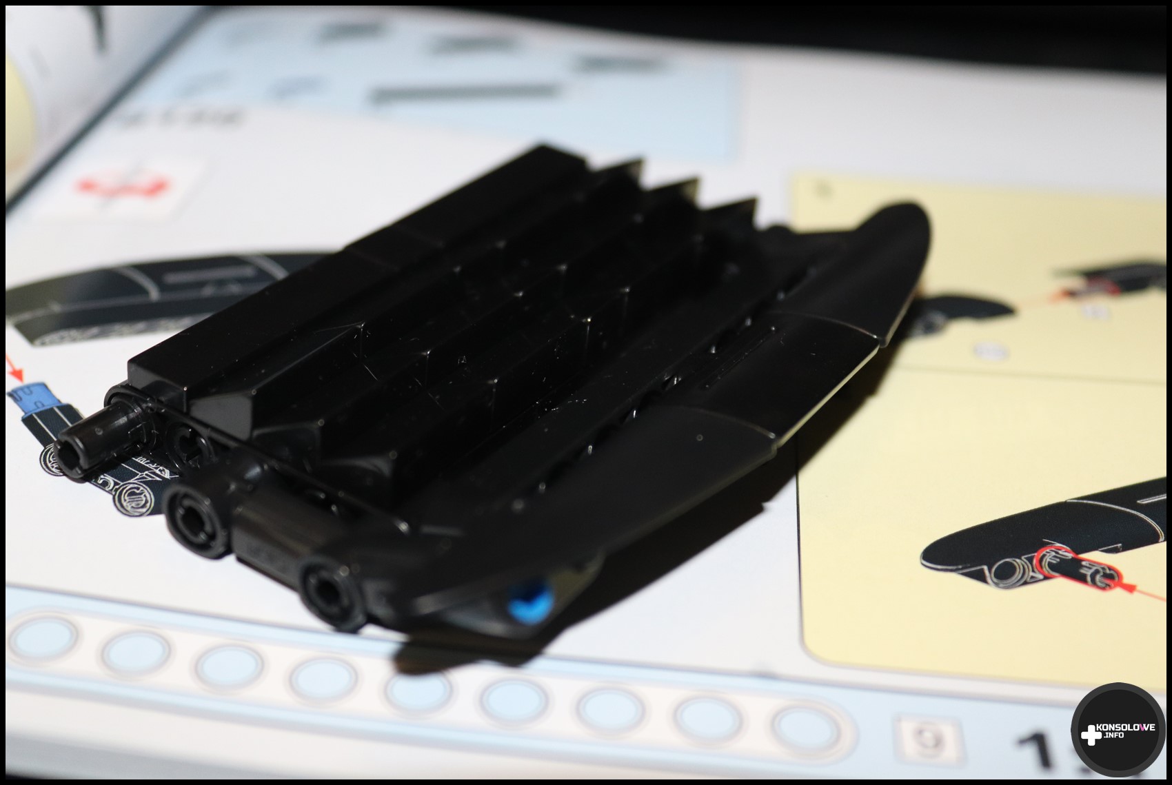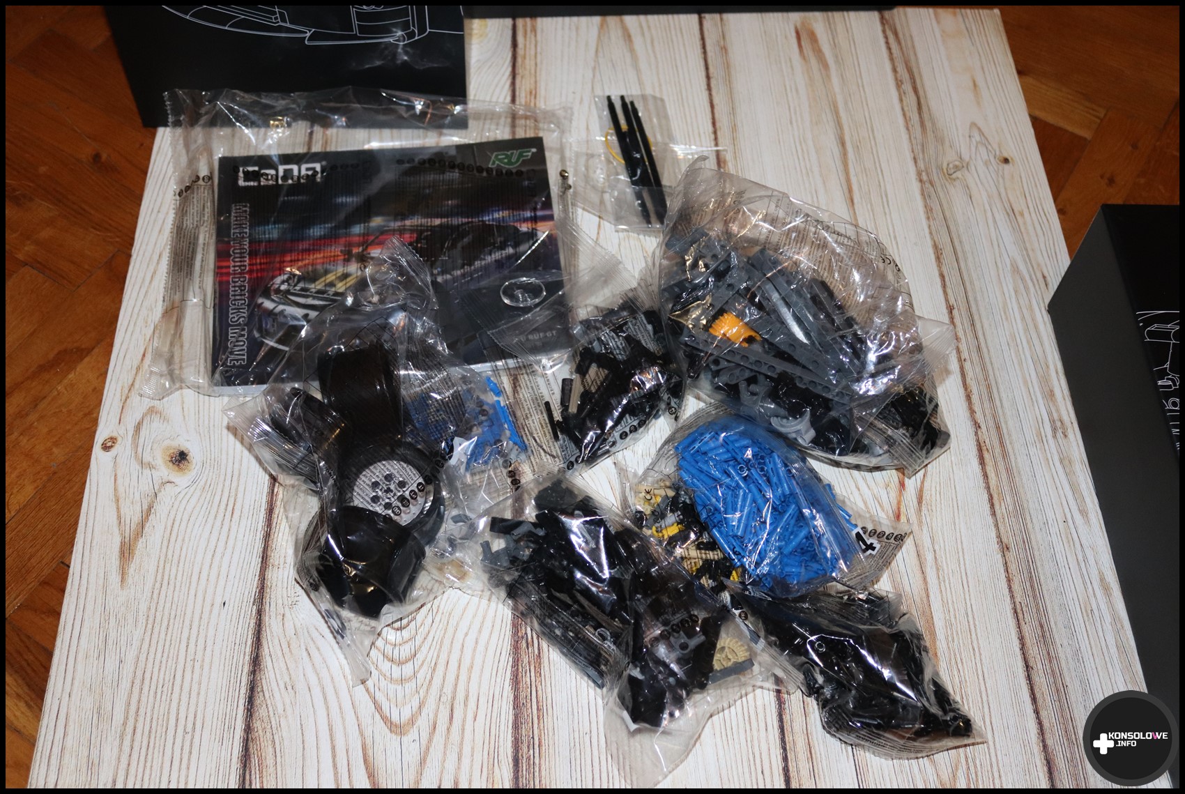 Następnie zbudujemy dość dużą bryłę, która zajmie nam niemało miejsca na biurku. Chodzi bowiem o kokpit. Co istotne, nie brakuje w nim bardzo ładnych naklejek przedstawiających różnego rodzaju wyświetlacze i wskaźniki naszego samochodu. Pulpit sterowniczy wygląda świetnie i nie ukrywam, że z ogromną przyjemnością obserwowałem, jak z poszczególnych klocków powstaje imponująca bryła. Nie bez znaczenia jest fakt, że zamontowałem także funkcjonalną kierownicę. Dzięki niej mogłem skręcać tylnymi kołami. Jednocześnie muszę Was przestrzec – jeśli chcielibyście jeździć i skręcać tym samochodem, to bez zainwestowania w osobny silnik nie ma takiej możliwości. Oś skrętu w żaden sposób nie jest połączona z zewnętrznymi elementami pojazdu (w przeciwieństwie na przykład do batmobilu z 2022 roku, który recenzowałem w tym miejscu). Niemniej jednak dzięki temu bryła samochodu od CaDA wygląda bardzo realistycznie po złożeniu modelu. Bardzo ładnie wyglądają też fotele, które możecie zobaczyć wyżej na zdjęciach.
