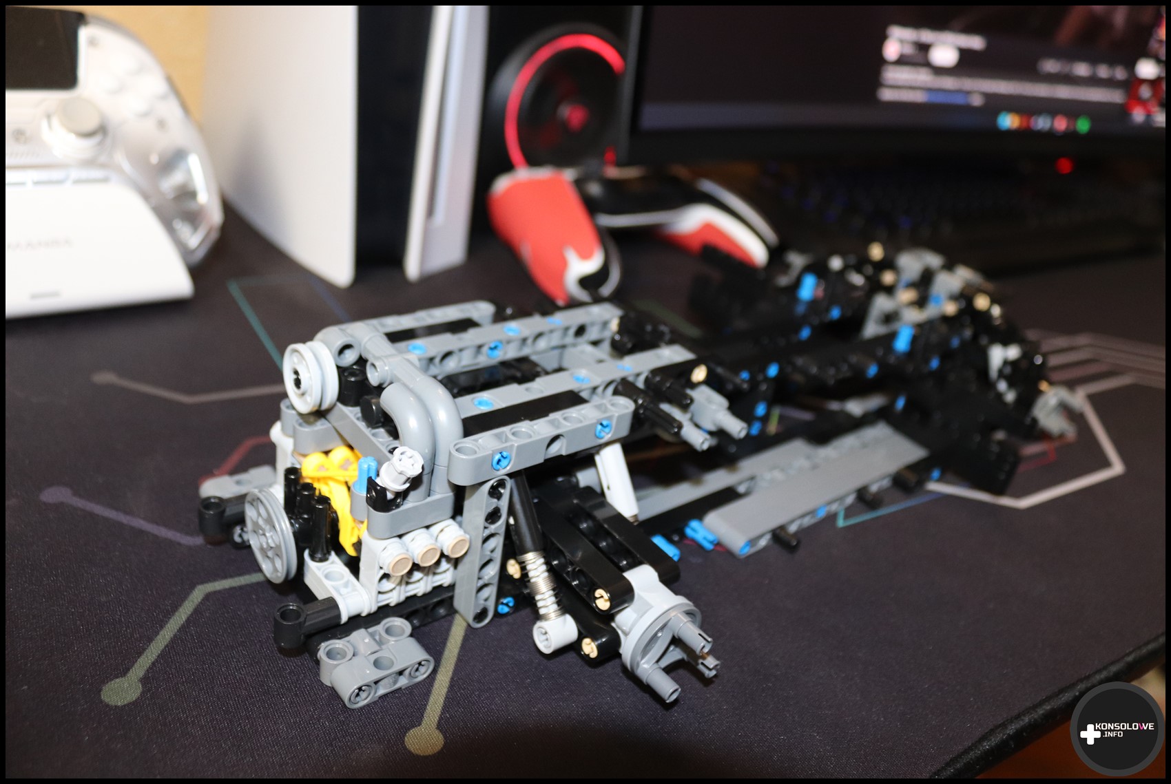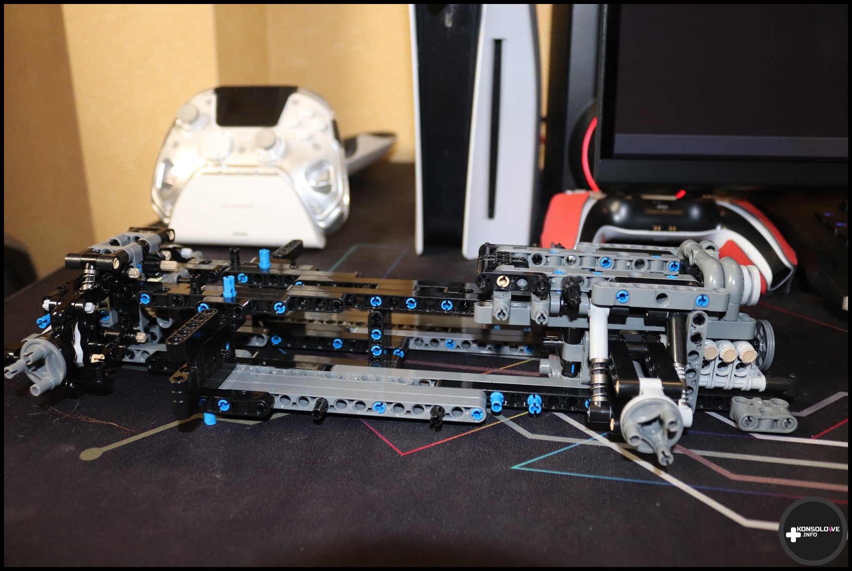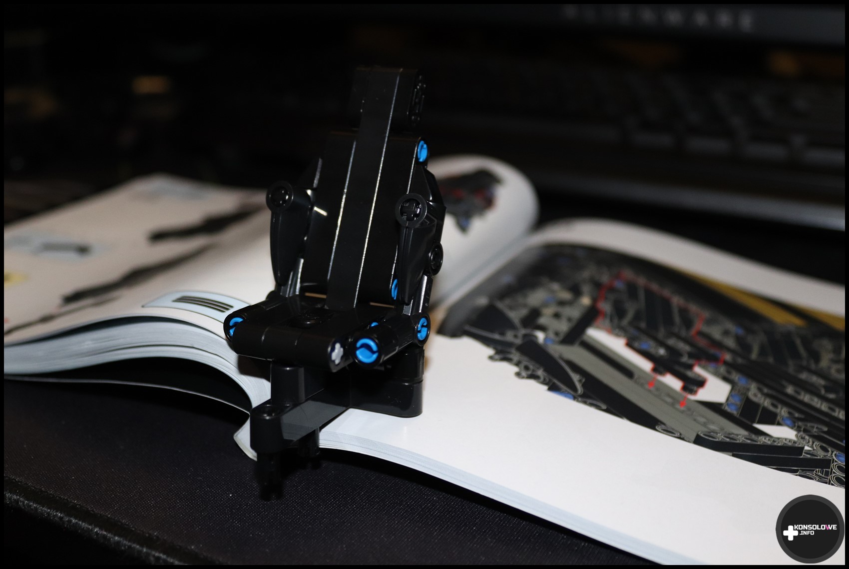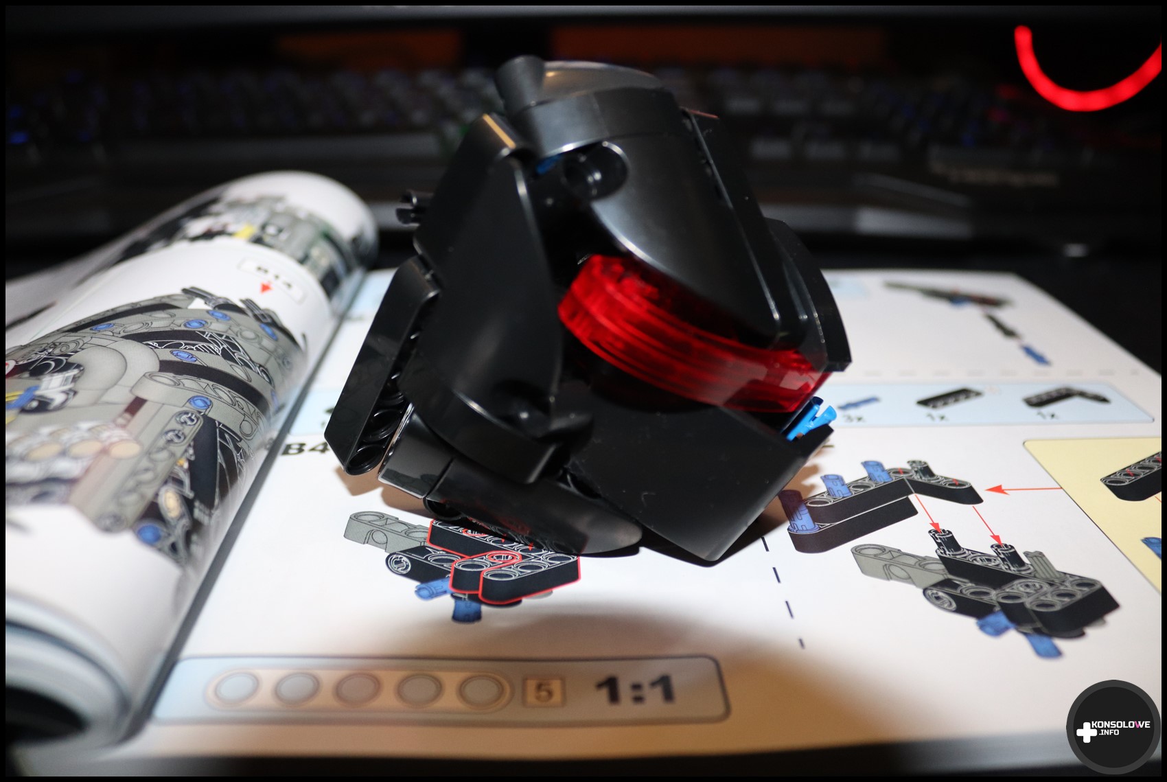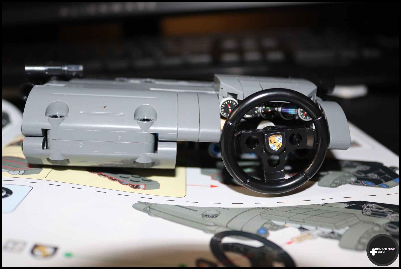 Następnie zbudujemy dość dużą bryłę, która zajmie nam niemało miejsca na biurku. Chodzi bowiem o kokpit. Co istotne, nie brakuje w nim bardzo ładnych naklejek przedstawiających różnego rodzaju wyświetlacze i wskaźniki naszego samochodu. Pulpit sterowniczy wygląda świetnie i nie ukrywam, że z ogromną przyjemnością obserwowałem, jak z poszczególnych klocków powstaje imponująca bryła. Nie bez znaczenia jest fakt, że zamontowałem także funkcjonalną kierownicę. Dzięki niej mogłem skręcać tylnymi kołami. Jednocześnie muszę Was przestrzec – jeśli chcielibyście jeździć i skręcać tym samochodem, to bez zainwestowania w osobny silnik nie ma takiej możliwości. Oś skrętu w żaden sposób nie jest połączona z zewnętrznymi elementami pojazdu (w przeciwieństwie na przykład do batmobilu z 2022 roku, który recenzowałem w tym miejscu). Niemniej jednak dzięki temu bryła samochodu od CaDA wygląda bardzo realistycznie po złożeniu modelu. Bardzo ładnie wyglądają też fotele, które możecie zobaczyć wyżej na zdjęciach.