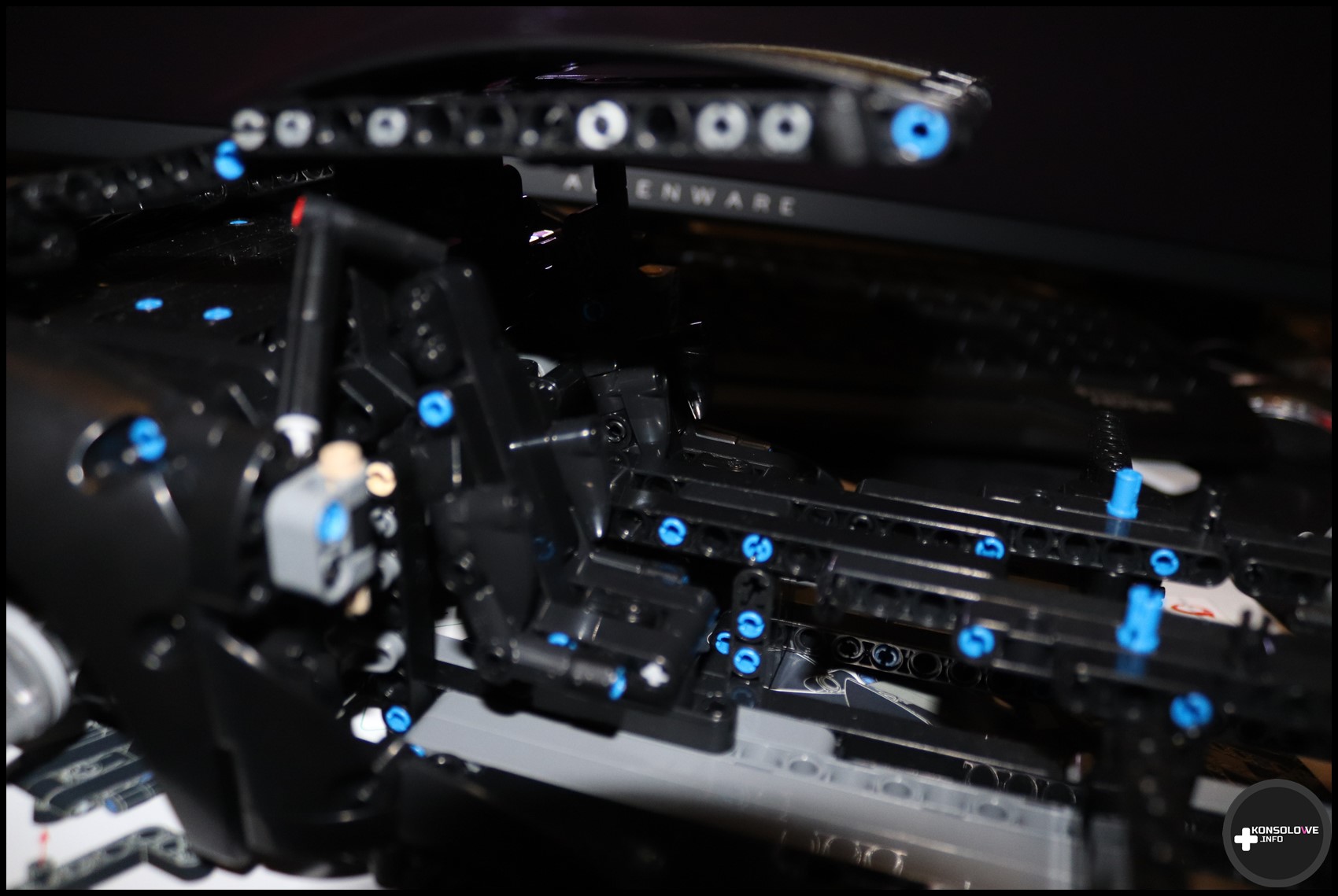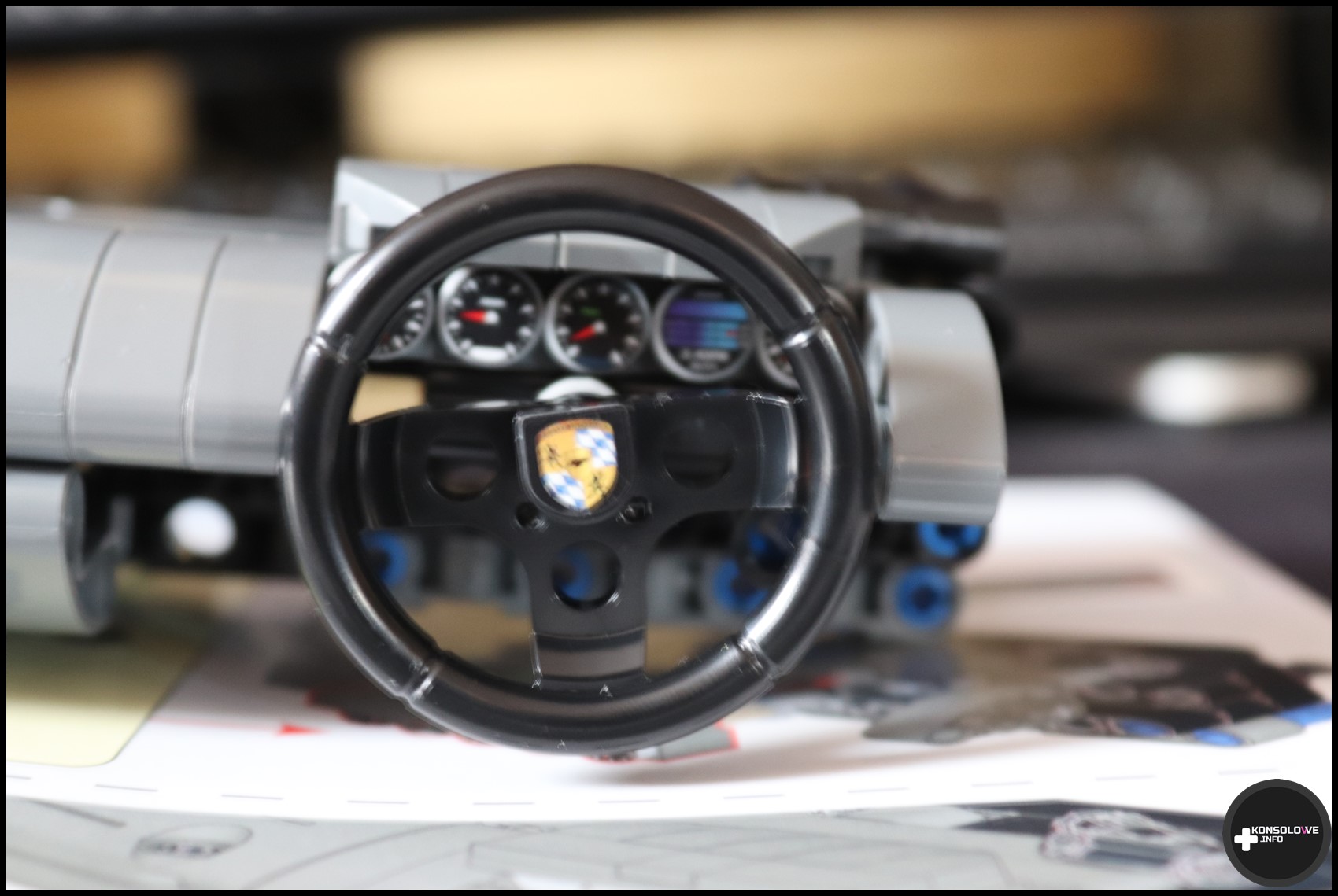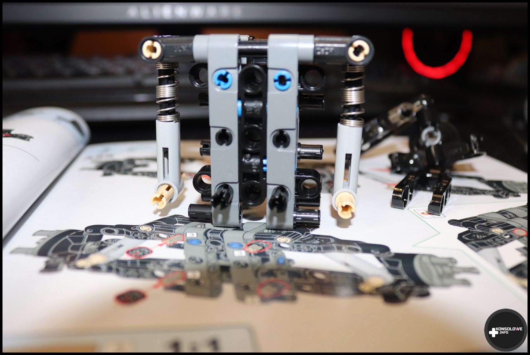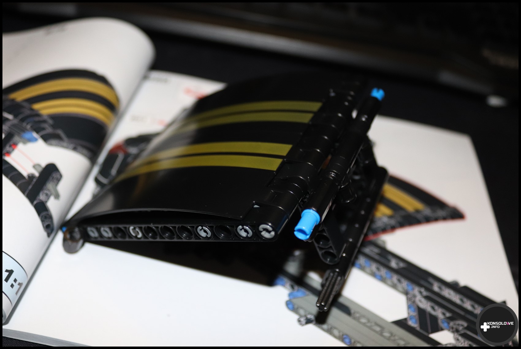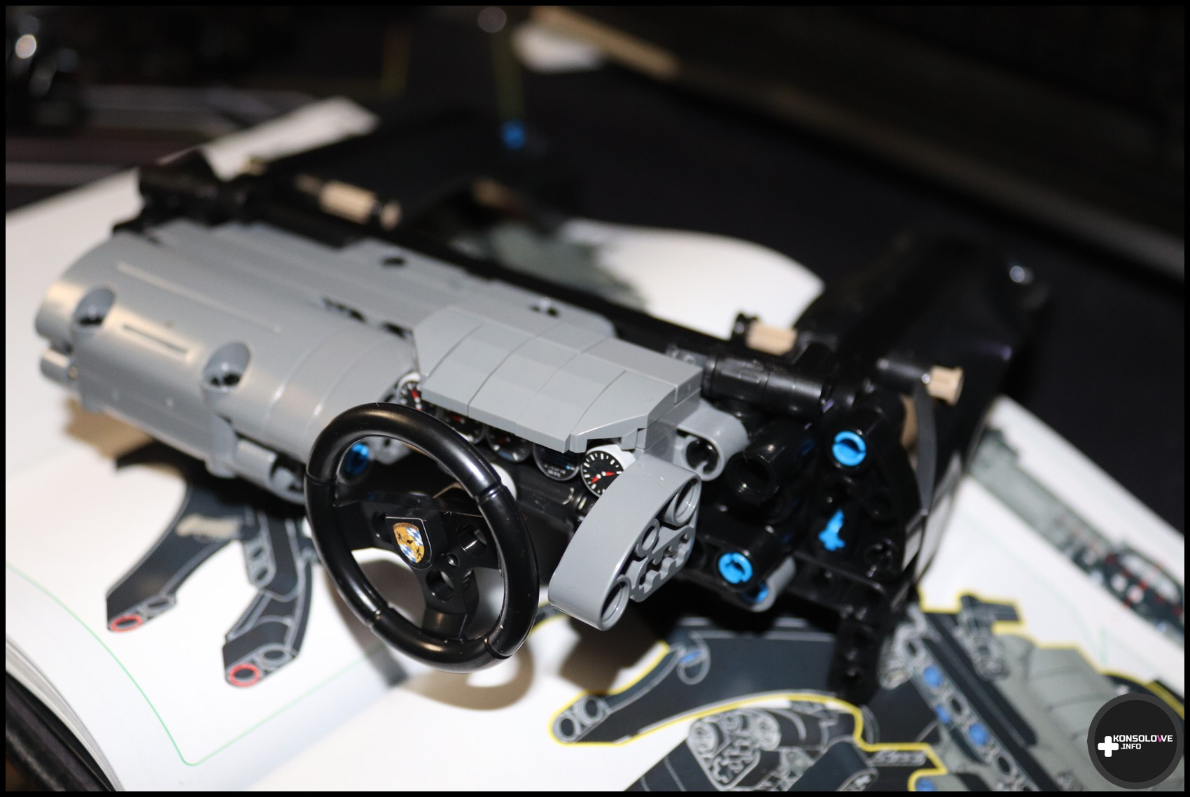 Następnie zbudujemy dość dużą bryłę, która zajmie nam niemało miejsca na biurku. Chodzi bowiem o kokpit. Co istotne, nie brakuje w nim bardzo ładnych naklejek przedstawiających różnego rodzaju wyświetlacze i wskaźniki naszego samochodu. Pulpit sterowniczy wygląda świetnie i nie ukrywam, że z ogromną przyjemnością obserwowałem, jak z poszczególnych klocków powstaje imponująca bryła. Nie bez znaczenia jest fakt, że zamontowałem także funkcjonalną kierownicę. Dzięki niej mogłem skręcać tylnymi kołami. Jednocześnie muszę Was przestrzec – jeśli chcielibyście jeździć i skręcać tym samochodem, to bez zainwestowania w osobny silnik nie ma takiej możliwości. Oś skrętu w żaden sposób nie jest połączona z zewnętrznymi elementami pojazdu (w przeciwieństwie na przykład do batmobilu z 2022 roku, który recenzowałem w tym miejscu). Niemniej jednak dzięki temu bryła samochodu od CaDA wygląda bardzo realistycznie po złożeniu modelu. Bardzo ładnie wyglądają też fotele, które możecie zobaczyć wyżej na zdjęciach.