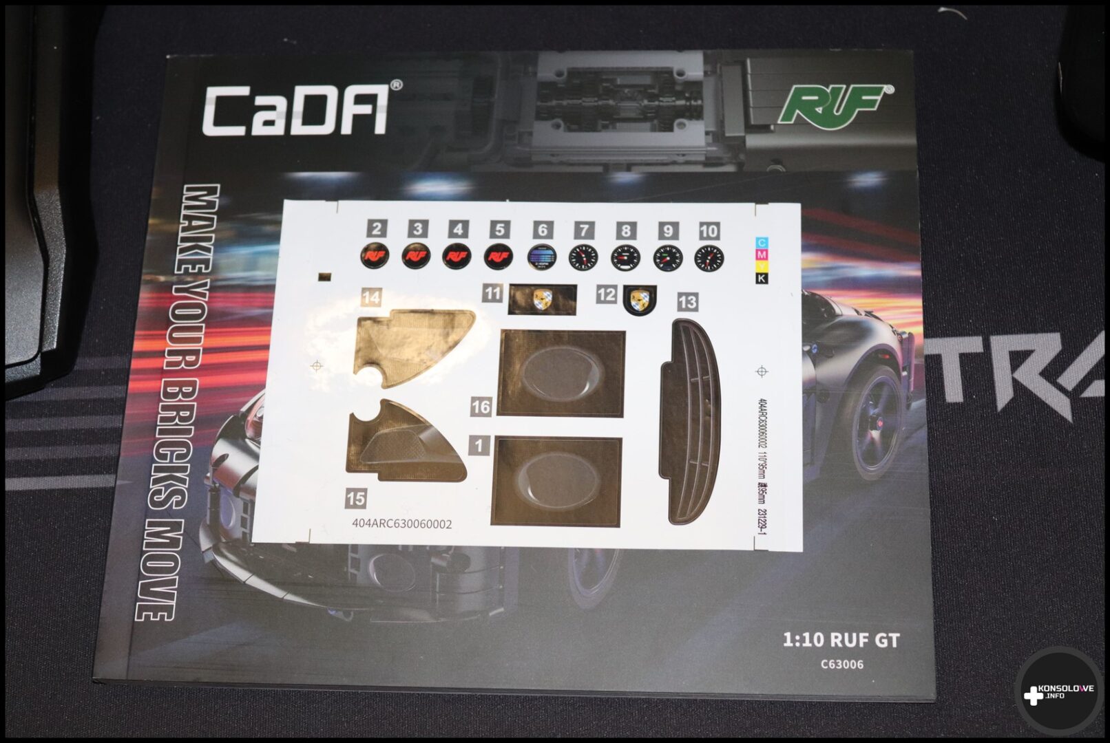 Model RUF GT C63006W przychodzi w dość sporym opakowaniu. Jego wymiary wynoszą bowiem 46 cm x 37,5 cm x 10,5 cm. Zanim zajrzymy do środka, warto przyjrzeć się frontowej części – widnieje na niej bardzo ładna wizualizacja samochodu, który można złożyć z zawartych klocków. Doceniam pewnego rodzaju szklenie, które zastosowano na wizualizacji. Dzięki temu obrys pojazdu i niektóre inne elementy są bardziej wypukłe i ładnie odbija się od nich światło. Nawet samo opakowanie z pewnością chętnie wyeksponuje w swoim pokoju niejeden fan motoryzacji. Podnieśmy jednak wreszcie wieko i zajrzyjmy do środka. Czeka nas na tam bardzo elegancko przedstawiony szkic techniczny samochodu zaznaczony na dwóch mniejszych kartonach. Te są dodatkowo podpisane jako 1 i 2. Znajdziemy w nich odpowiednio 12 i 13 foliowych worków. W pierwszym jest naturalnie instrukcja, a także jeden arkusz z kilkunastoma naklejkami. Szybko zauważyłem niestety pewną przewagę LEGO nad CaDA. Przejawiła się ona w 3 punktach: