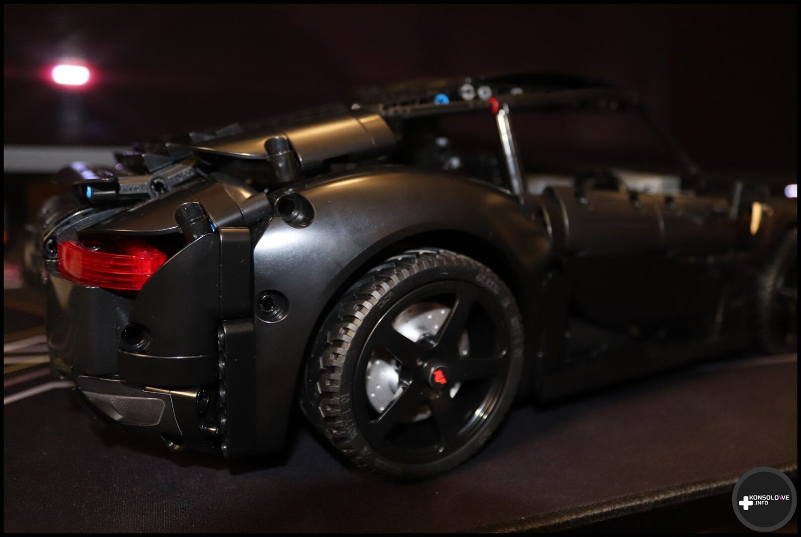 Dalsze budowanie modelu pozwoli nam przyjrzeć się tylnej części pojazdu. Na wyróżnienie zasługuje tu przede wszystkim tablica rejestracyjna. Bardzo spodobało mi się to, że nie musimy jej sami naklejać – dostajemy już bowiem gotowy kafelek z umieszczoną na nim rejestracją. Nie jestem fanem naklejek (choć w recenzowanym dziś zestawie znajduje się ich trochę), więc powitałem ten element z ogromną ulgą. Kontynuując łączenie klocków, zabudujemy okolice tablicy rejestracyjnej. Świetnie prezentują się czerwone światła zrobione z półprzezroczystych płaskich klocków w odpowiednim kolorze. Efekt jest naprawdę fantastyczny. Zbudujemy też bardzo ładną osłonę silnika. Co ważne, możemy ją podnosić, aby zobaczyć jak pracuje wspomniany silnik. Natomiast, aby domknąć pokrywę, musimy ją oczywiście opuścić i minimalnie docisnąć z satysfakcjonującym odgłosem kliknięcia. Nie mogę się tu przyczepić do żadnego kroku i nie zamierzam – póki co CaDA zaproponowała bardzo udane rozwiązania i aż chce się układać dalej. Nie mogę też nie docenić bardzo ładnego wizualnie dachu, który również posiadał już umieszczone elementy dekoracyjne. Chodzi mi oczywiście o pasy idące przez całą długość dachu. Zamontujemy też osłony kół, a nasza bryła stanie się coraz bardziej masywna i imponująca swoim rozmiarem. Aż byłem ciekaw, co będzie mnie czekało w krokach przypisanych do litery C.