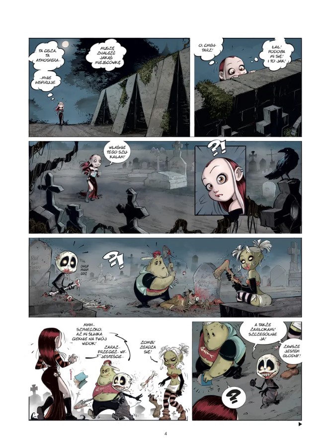 Czapki z głów za pomysł na połączenie tematyki zombie z historią dla najmłodszych czytelników okraszoną sporą dawką humoru. Do tego dodajmy jeszcze istotny fakt, iż w komiksie znajdziemy Hulka czy też głównych bohaterów The Walking Dead! Mroczna okładka z upiornym zombie i dziewczyną o niepokojącym spojrzeniu wydawała mi się intrygująca, a zarazem w jakiś sposób niekoniecznie poważna. Ten grymas na twarzy sprawiał od początku wrażenie, iż nie jest to zwykły komiks dla dzieciaków. Główną bohaterką jest przedstawiona już wcześniej Margotka, która miała już dość domowych krzyków i uciekła, szukając spokojnego schronienia na… cmentarzu. No spokój, to tam na pewno mają w jakimś sensie. Właśnie tam poznaje uroczego, małego zombiaka, który ostatecznie nalega, by dziewczyna spisała jego historię w swoich wierszach.