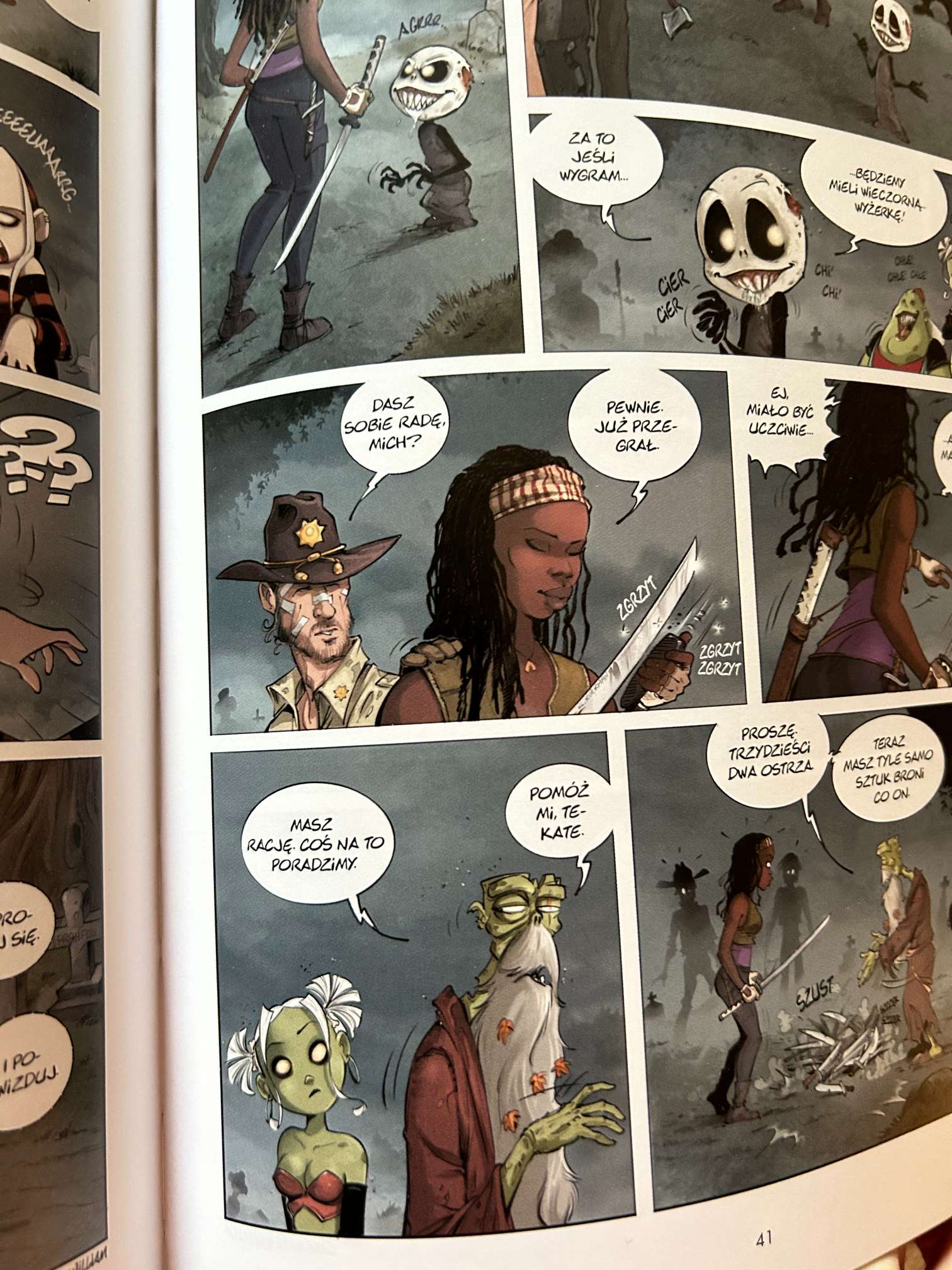Czapki z głów za pomysł na połączenie tematyki zombie z historią dla najmłodszych czytelników okraszoną sporą dawką humoru. Do tego dodajmy jeszcze istotny fakt, iż w komiksie znajdziemy Hulka czy też głównych bohaterów The Walking Dead! Mroczna okładka z upiornym zombie i dziewczyną o niepokojącym spojrzeniu wydawała mi się intrygująca, a zarazem w jakiś sposób niekoniecznie poważna. Ten grymas na twarzy sprawiał od początku wrażenie, iż nie jest to zwykły komiks dla dzieciaków. Główną bohaterką jest przedstawiona już wcześniej Margotka, która miała już dość domowych krzyków i uciekła, szukając spokojnego schronienia na… cmentarzu. No spokój, to tam na pewno mają w jakimś sensie. Właśnie tam poznaje uroczego, małego zombiaka, który ostatecznie nalega, by dziewczyna spisała jego historię w swoich wierszach.