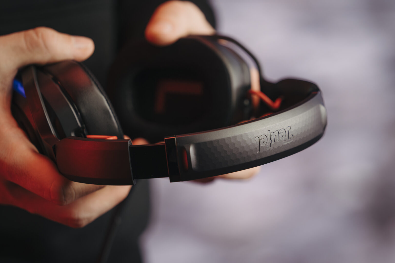 Słuchawki gamingowe nie powinny obciążać naszej głowy podczas długich sesji użytkowania… W celu zmaksymalizowania komfortu noszenia, Teufel zastosował wyjątkowo duże nauszniki, które z jednej strony pewnie przylegają do uszu i blokują hałas zewnętrzny. Z drugiej nie uciskają ich nawet podczas noszenia okularów. System wentylacji w nausznikach zapobiega gromadzeniu się ciepła, które towarzyszy graczom szczególnie podczas długich misji.