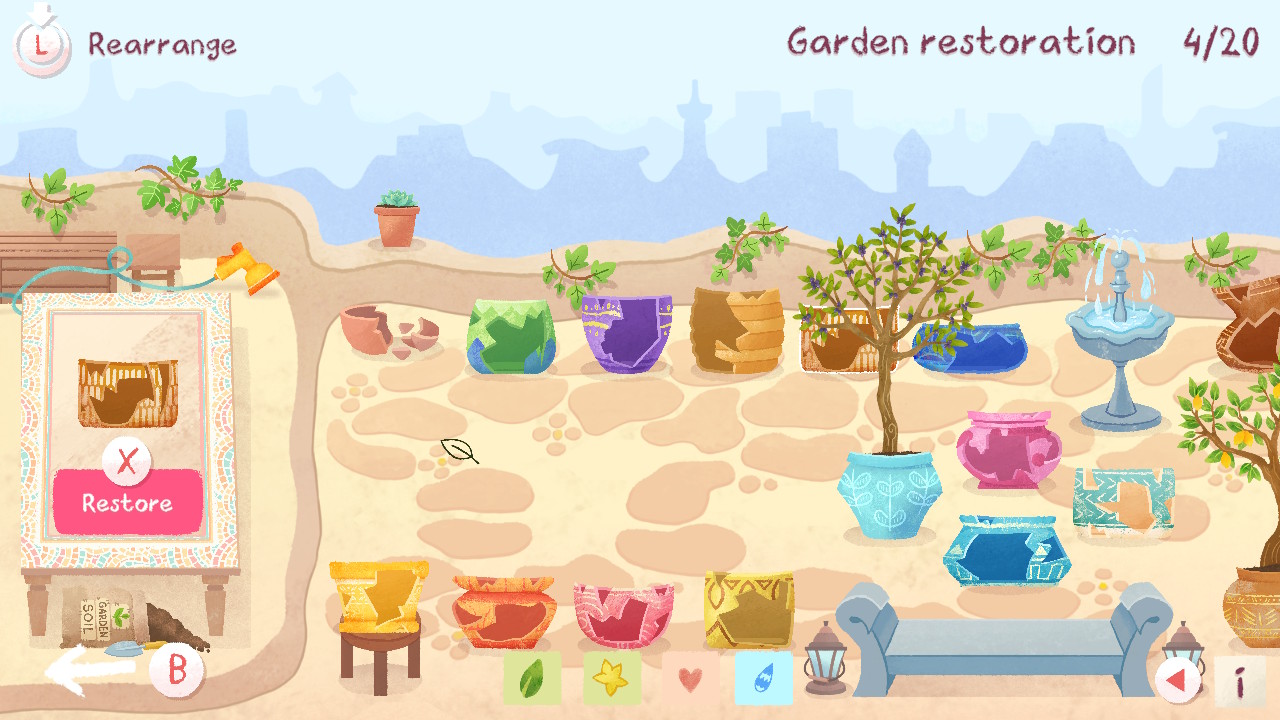 W tym celu musimy naprawić 30 potłuczonych doniczek, których kawałki wymagają sklejenia ze sobą. Cała zabawa polega tak naprawdę na dopasowywaniu ze sobą różnokolorowych puzzli. Mimo że poszczególne elementy są porozrzucane i w pierwszej chwili wydają się nigdzie nie pasować, tak jednak odmienne wzory obecne na ceramice podpowiadają, jak należy obrócić odłamek i w którym miejscu go przykleić. Po poprawnym sklejeniu wszystkich elementów doniczka jest gotowa do użycia. Wówczas możemy kolejno napełnić ją ziemią, nasypać do środka nasion, podlać i wystawić na promienie słoneczne. Gotowe! Na końcu zbieramy owoce i… to tyle. Możemy zająć się kolejną doniczką. Co prawda, zebrane plony możemy przekazać przyjaciołom Amelii, jednak nie ma to żadnego wpływu na dalszą rozgrywkę.