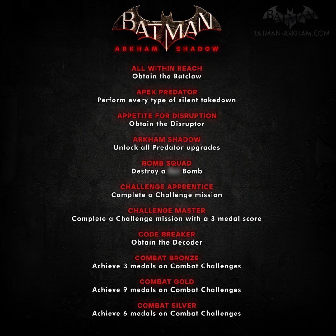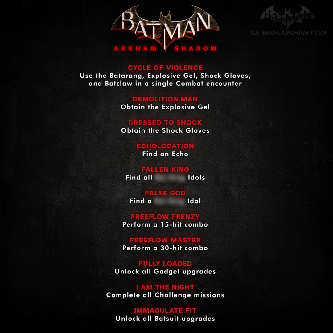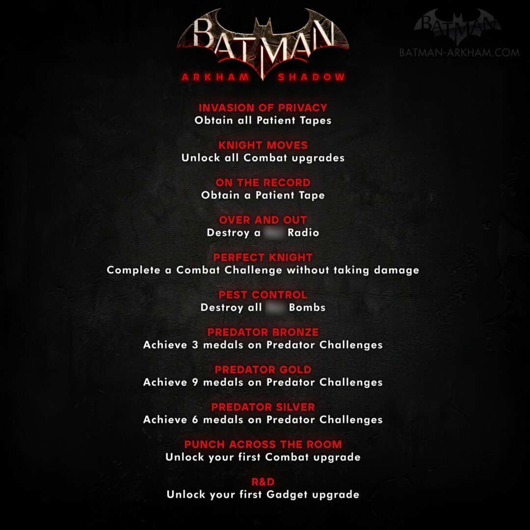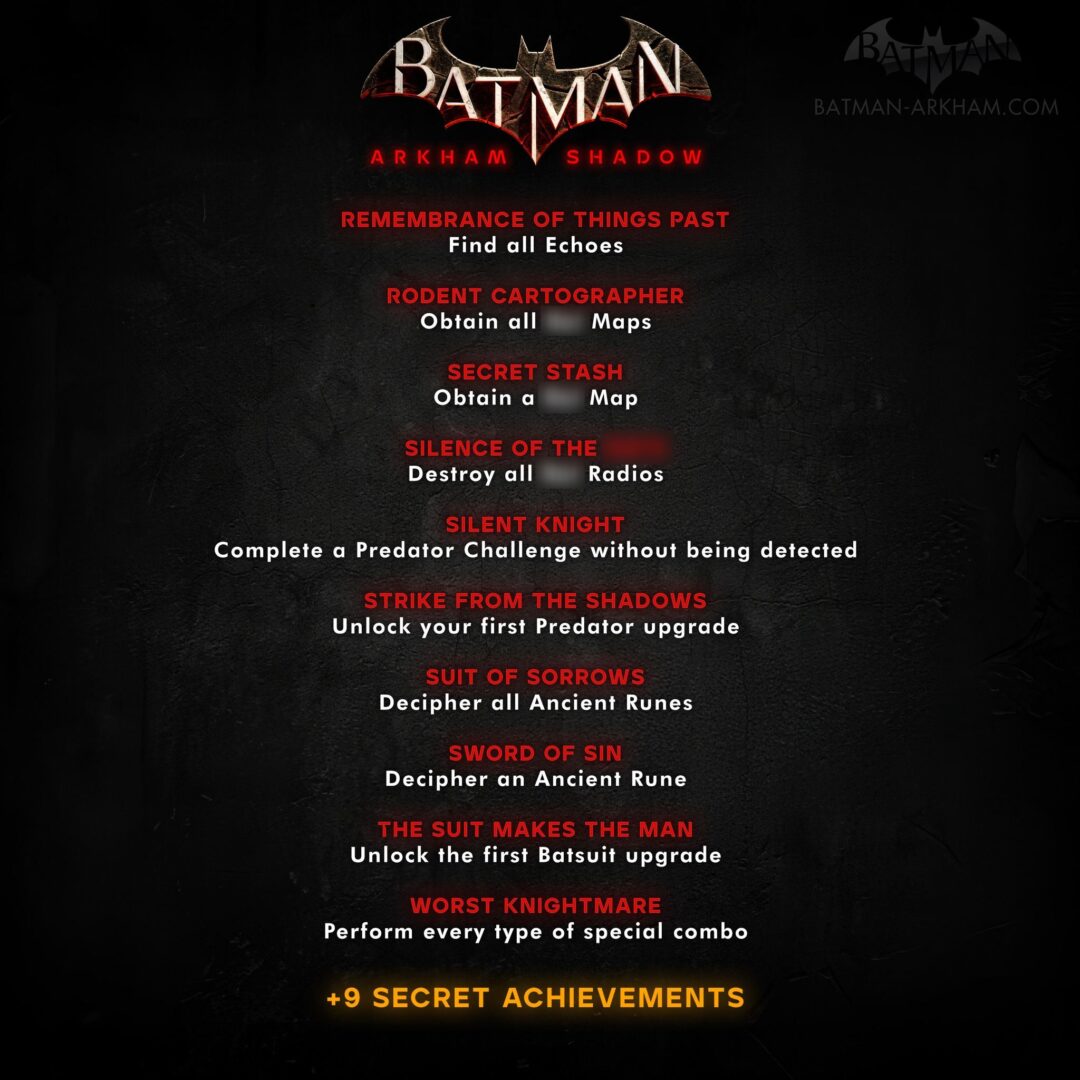 Już za niecały tydzień ukaże się Batman: Arkham Shadow. Wielokrotnie pisałem o tej grze na naszym portalu. Do wszystkich newsów na temat najnowszego dzieła studia Camouflaj możecie przejść z tego odnośnika. Natomiast niżej znajdziecie listę większości osiągnięć, jakie będzie można zdobyć w tej produkcji. Nie powinno być na niej spoilerów. Dodatkowo rozmazałem niektóre fragmenty, które mogły zdradzać wydarzenia i wyjawiać postaci z tej gry.