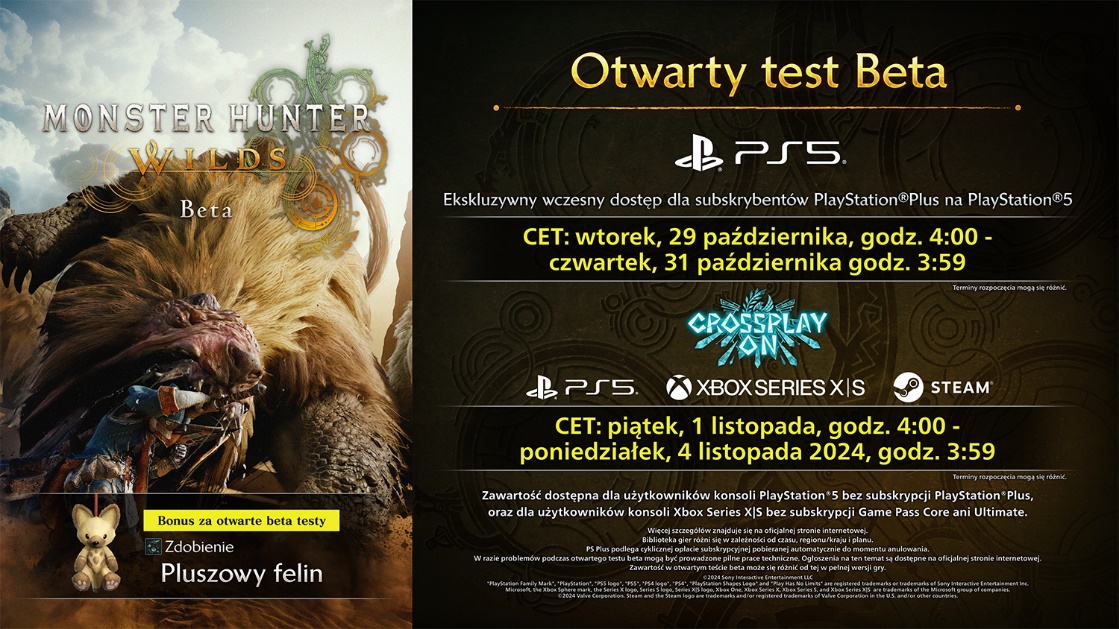 Otwarte testy beta Monster Hunter Wilds odbędą się w przyszłym tygodniu na PlayStation 5, Xbox Series X|S i PC za pośrednictwem Steam. Testy potrwają od 1 do 4 listopada, a subskrybenci PlayStation Plus będą mogli rozpocząć grę na PlayStation 5 dzięki ekskluzywnemu okresowi wczesnego dostępu, który rozpocznie się 29 października. Jeśli chcesz grać offline, możesz wezwać AI Support Hunters, aby uzyskać wsparcie w czasie polowania. Szczegóły znajdziesz na oficjalnej stronie gry.