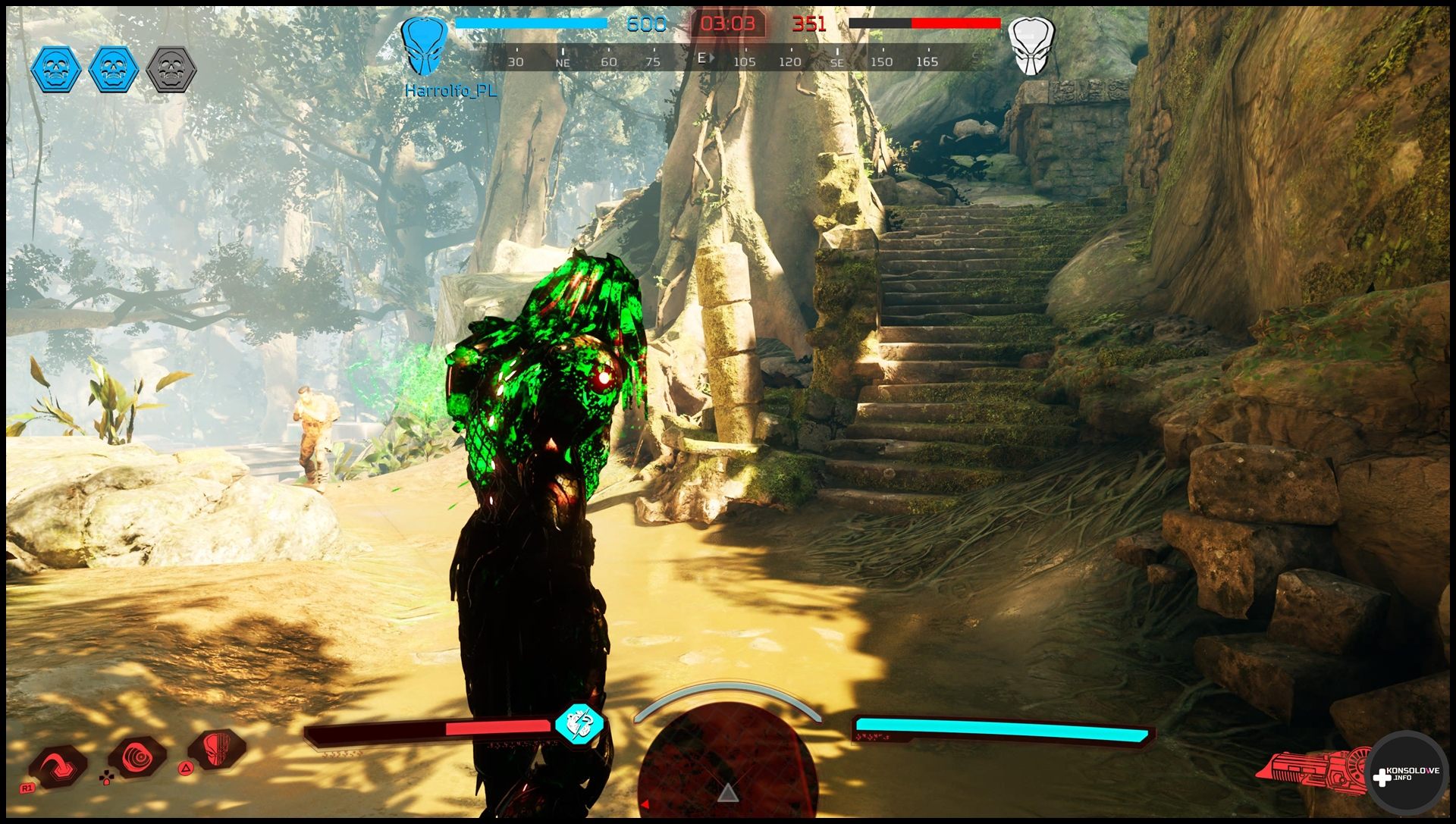 Nie ukrywam, że sięgnąłem po Predator: Hunting Grounds, zachęcony zapowiedzianą obsługą funkcji pada DualSense. Chodzi mi oczywiście o efekty dotykowe oraz adaptacyjne spusty. No i cóż… Jestem ogromnie zawiedziony. Chciałbym móc cokolwiek napisać o wykorzystaniu potencjału drzemiącego w tym kontrolerze. Prawda jednak jest taka, że nie odczułem zaadaptowania tych funkcji choćby w najmniejszym stopniu. Nie znalazłem też opcji włączenia/wyłączenia czegokolwiek z tym związanego w menu ustawień kontrolera. Może więc chociaż graficznie można pochwalić tę produkcję na PS5? I tak, i nie. Tekstury są co prawda nieco lepsze niż w przypadku wersji na PS4 (zwłaszcza w przypadku broni), aczkolwiek nie jest to nic wybitnego. Miłym dodatkiem jest delikatny ray-tracing, aczkolwiek nie sposób nie zauważyć często rozmazanych tekstur nawet na PS5. Niżej możecie zerknąć na dwa zrzuty porównujące grafikę między wersją na PS4, a na PS5.