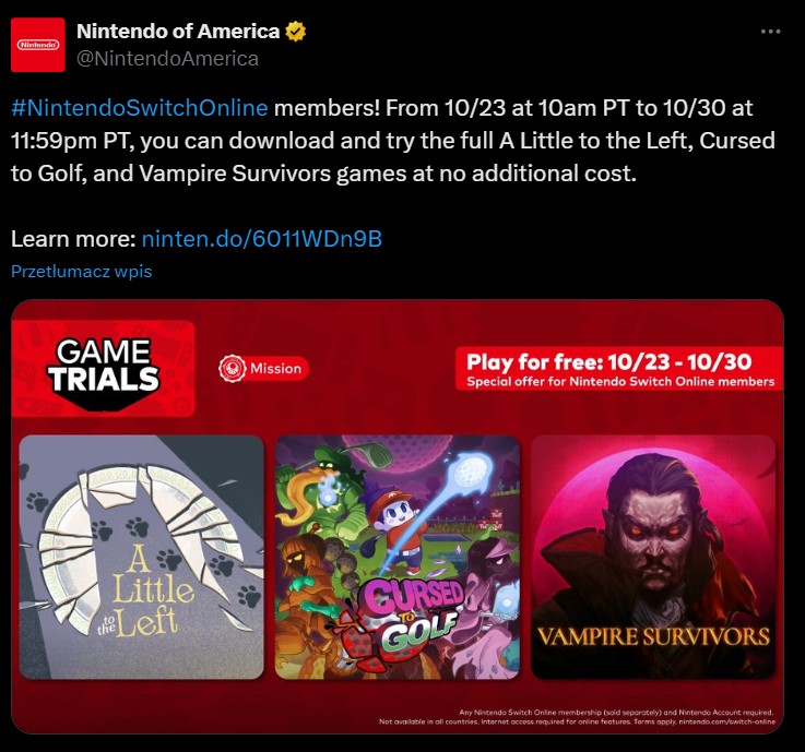 Game Trials od firmy Nintendo działa zupełnie tak samo. Tyle że jest dostępne tylko na konsoli Nintendo Switch, w subskrypcji Nintendo Switch Online. Pierwsza edycja trwa od 23 do 30 października 2024. Wśród udostępnionych gier jest ciepło przyjęty rogalik Cursed to Golf o tematyce golfowej. Oprócz niego dostaliśmy spokojną produkcję A Little to the Left, w której układamy różne przedmioty w ładne aranżacje. Dodatkowo na terenie Europy możemy zagrać w popularny dungeon crawler Minecraft Dungeons. Natomiast gracze ze Stanów Zjednoczonych otrzymali znany roguelite Vampire Survivors.
