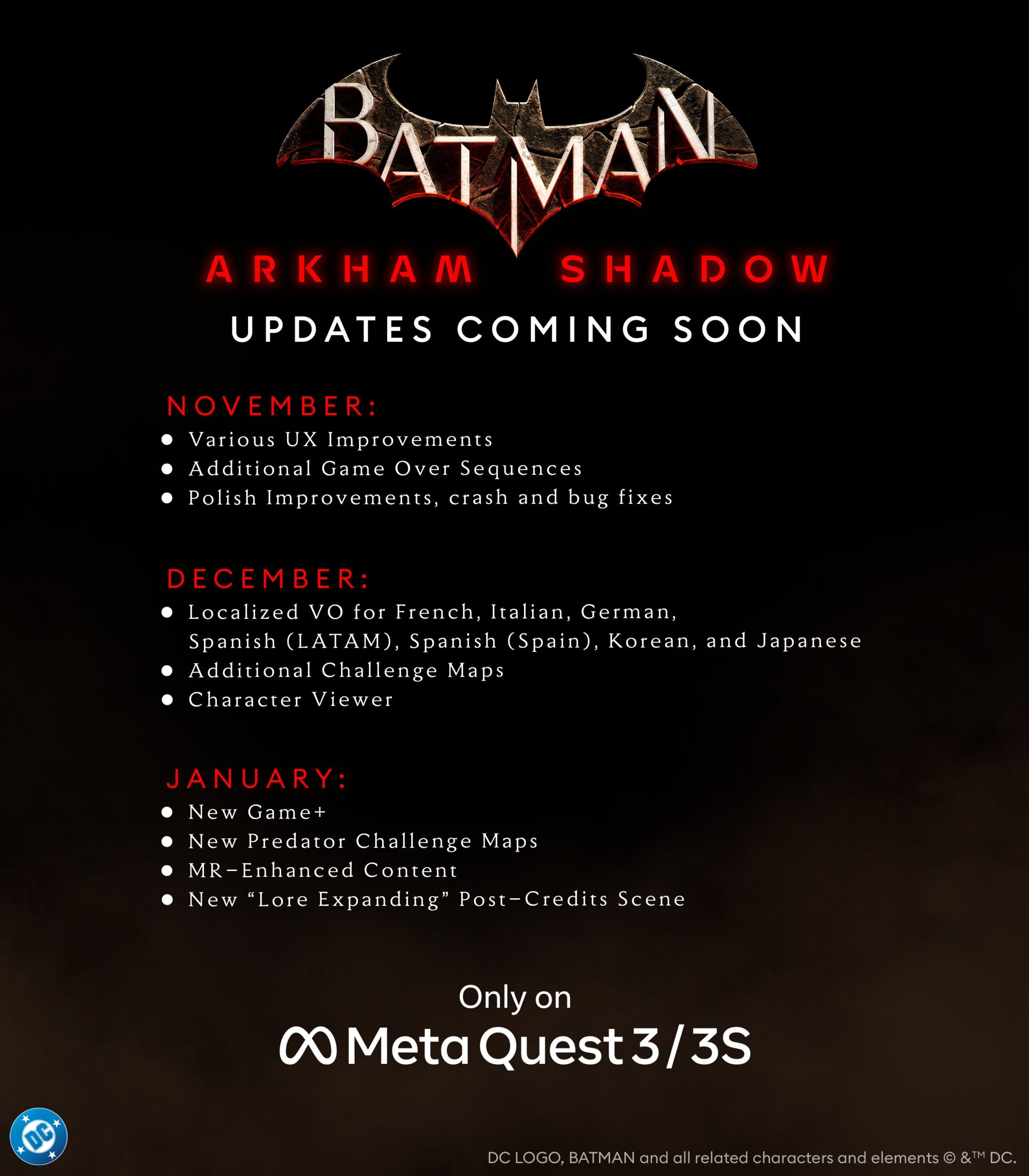 Jeśli czekacie na dalsze etapy rozwijania Batmana, to mam dla Was dobrą wiadomość. W mediach społecznościowych pojawiła się bowiem poniższa grafika. Wynika z niej, że w tym miesiącu dodane zostaną sekwencje po niepowodzeniu w misjach. Nie zabraknie też naturalnie ogólnych poprawek. Natomiast w grudniu do gry trafia dodatkowe mapy trybu wyzwań oraz prezentacje postaci. W styczniu z kolei będzie chyba najbardziej interesującą aktualizacją. Dzięki niej otrzymamy Nową Grę+ oraz nowe mapy wyzwań łowcy. Ponadto będziemy mogli korzystać ze wzbogaconej o mieszaną rzeczywistość zawartości. Co więcej, przygotowana zostanie scena po napisach. Będzie ona miała rozszerzyć wiedzę o świecie. Niżej możecie zapoznać się z odpowiednią grafiką.