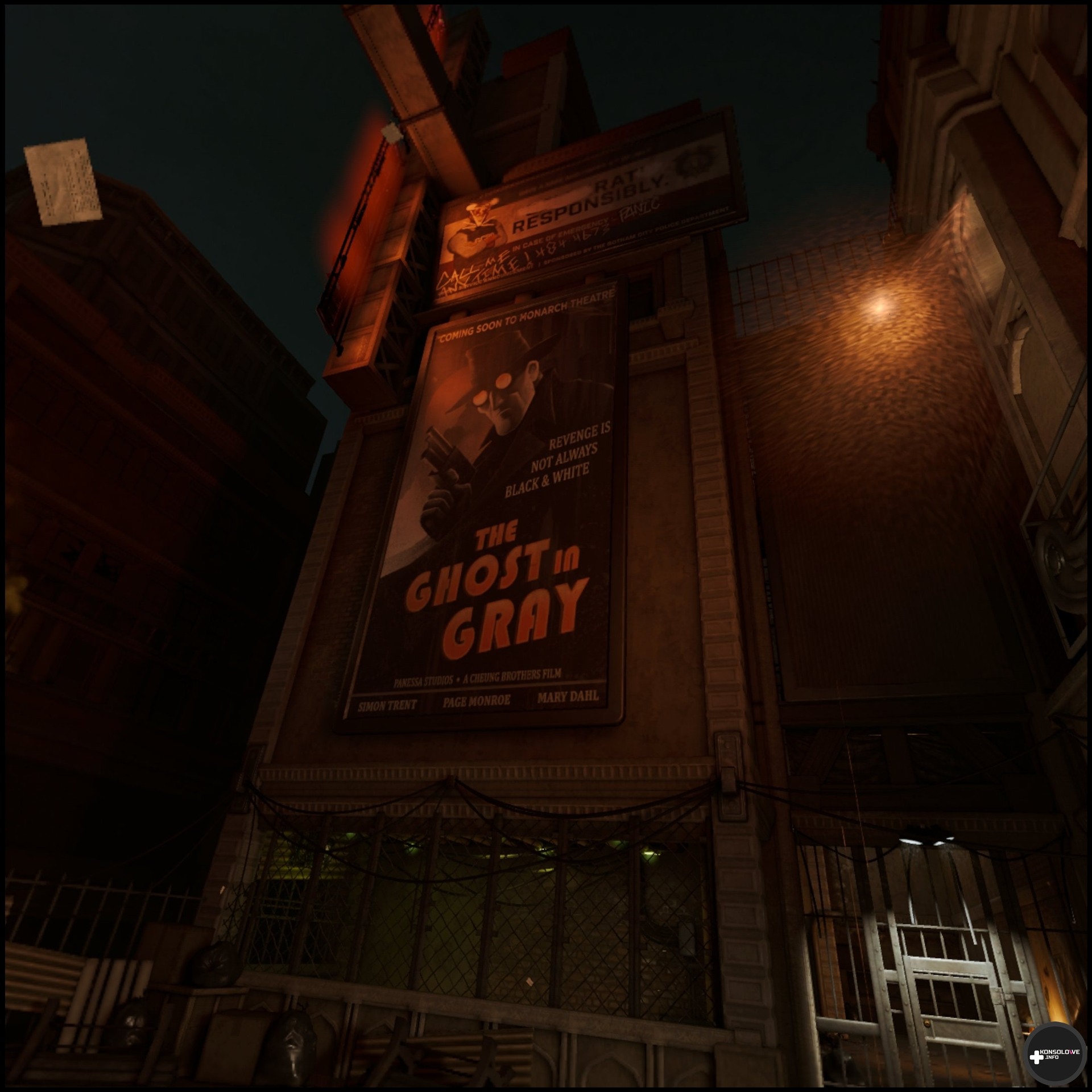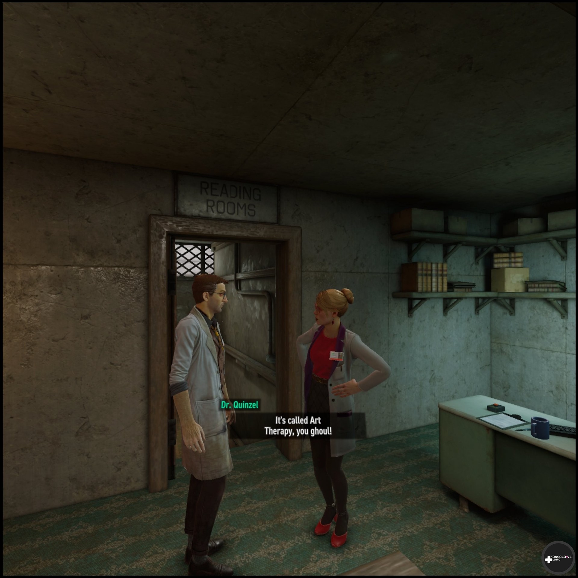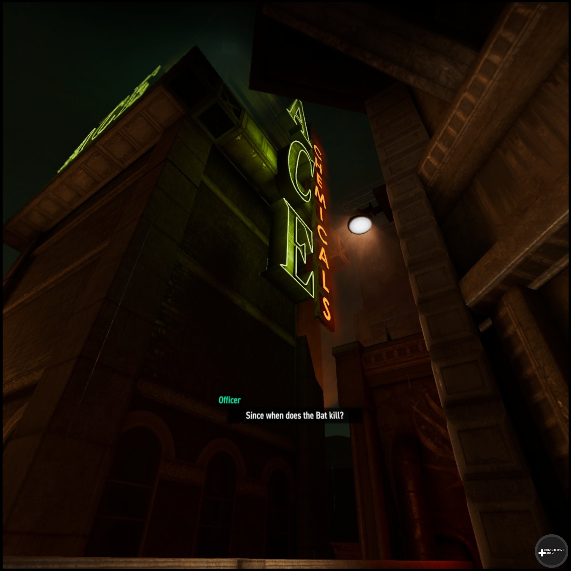 Podobnie zresztą jak cień, który widzimy podczas szybowania. Oczywiście aby zacząć szybować, wyciągamy ręki na boki i trzymamy pelerynę (przytrzymujemy oba spusty). Naturalnie rozpościeraniu peleryny (jak również końcowi szybowania) towarzyszy charakterystyczny dźwięk. Warto jeszcze poświecić chwilę udźwiękowieniu. Świetnie wypadają aktorzy wcielający się w postaci, jakie spotkamy na swojej drodze. Więcej o obsadzie pisałem w tym newsie. Bardzo spodobał mi się Elijah Woods jako Dr. Jonathan Crane, czy Roger Craig Smith podkładający głos Batmanowi. Idealnie ponownie wcielił się w tego bohatera i w jego głosie słychać zniecierpliwienie oraz agresję. Naturalnie Tara Strong jako Harleen Queen również spisała się na medal. Przypadło mi do gustu także przywiązanie do szczegółów. Przemierzając Gotham, co chwilę natkniemy się na odwołania do postaci i miejsc znanych ze stron komiksów DC Comics.