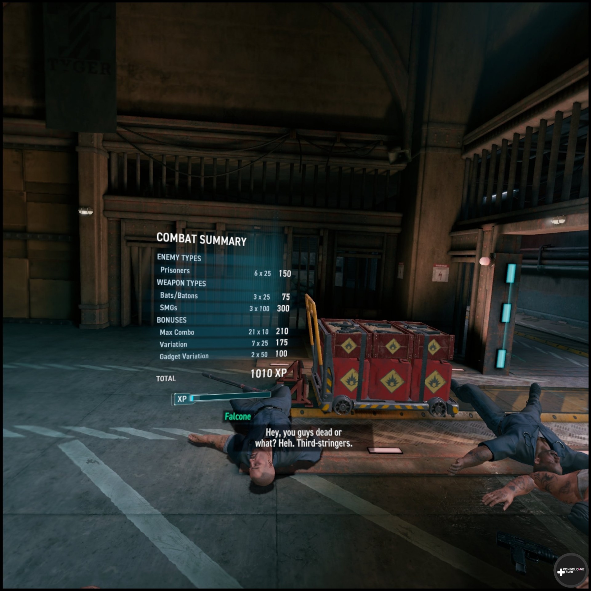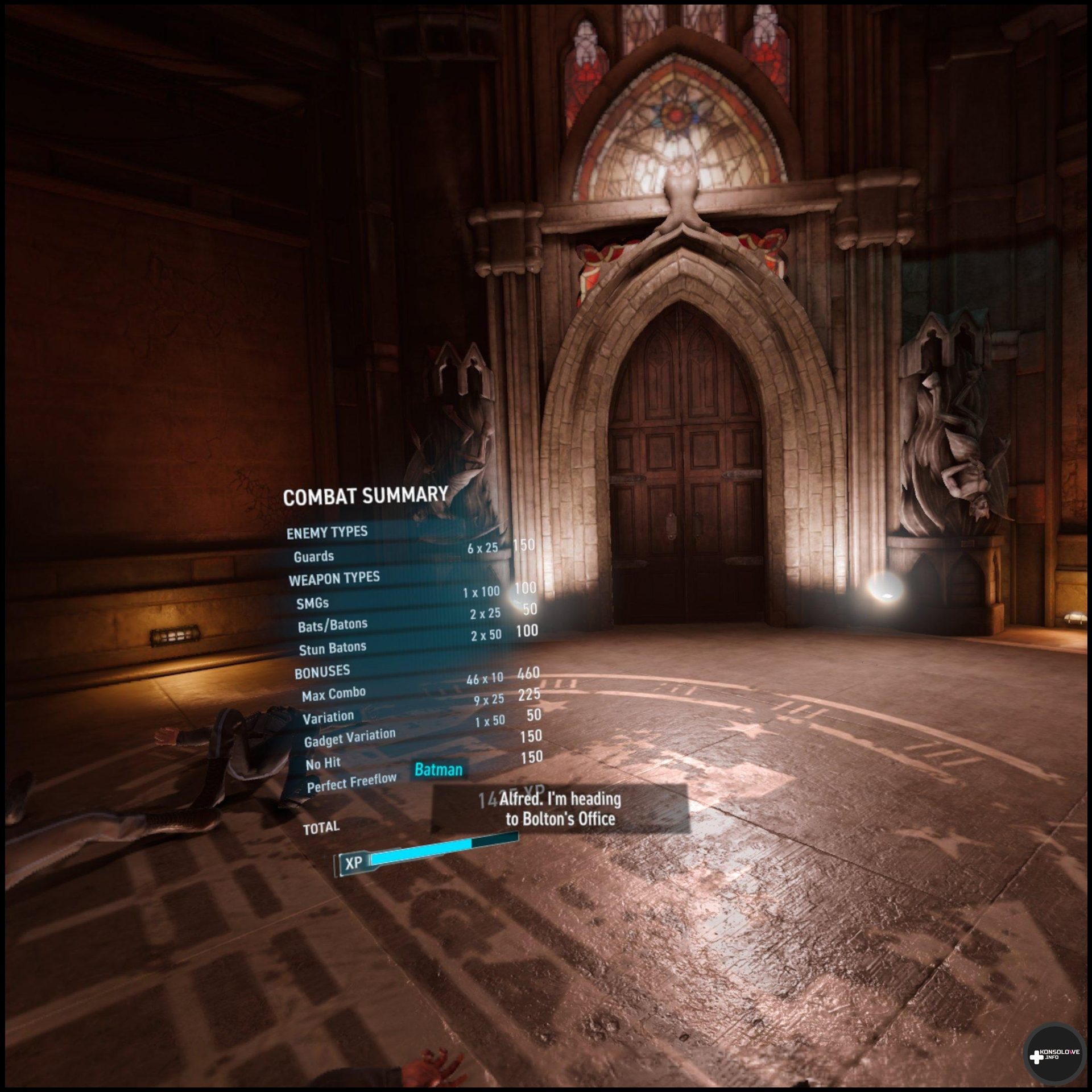 Co jakiś czas będziemy widzieć oznaczenia pięści na bokach ekranu. Należy wtedy wykonać uderzenie w tę stronę, aby skontrować nadchodzący spoza widocznego miejsca cios. Strasznie spodobało mi się unikanie ataków nożowników – musimy wychylać głowę na boki, a nawet kucać! Niesamowicie zwiększa to immersję, to trzeba samemu poczuć – można poczuć się jak sam Mroczny Rycerz. Naturalnie każde starcie kończy się podsumowaniem naszej wydajności. Podobnie jak w Arkhamach od Rocksteady widzimy ilu pokonaliśmy przeciwników, jakie było zróżnicowanie gadżetów, maksymalna kombinacja oraz na przykład czy odnieśliśmy jakieś obrażenia. Podsumowanie to wygląda dokładnie tak samo jak w Batman: Arkham Knight, co jest w moich oczach zaletą.