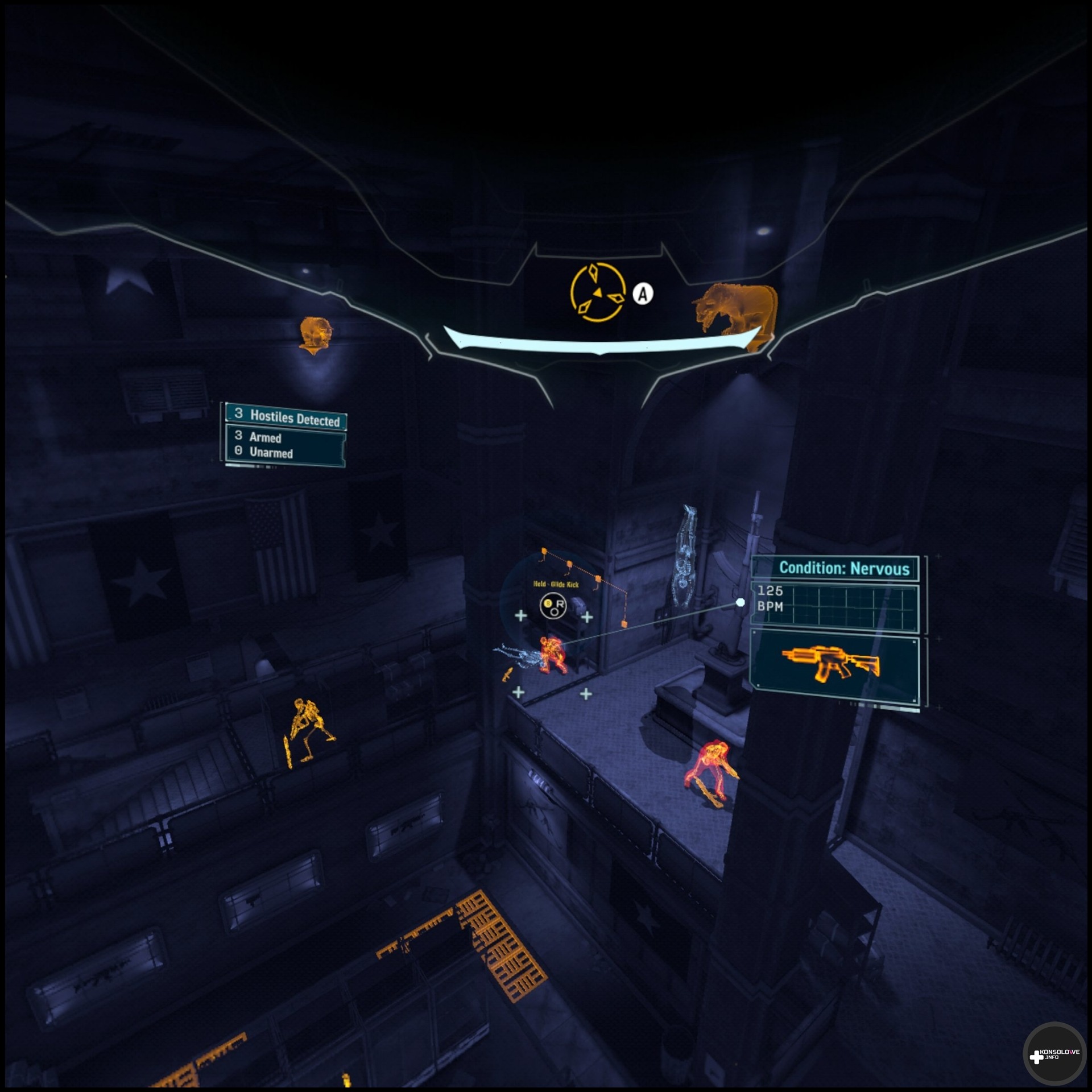 Możemy także wejść pod kratkę w podłodze, skąd zaatakujemy następnie niczego niespodziewającego się wroga, czy rzucimy bombą dymną, utrudniając przeciwnikom dostrzeżenie nas. Nic nie stoi na przeszkodzie, aby cisnąć nią po wyjęciu jej z gniazda na lewej rękawicy, ale też po porostu naciskając B na kontrolerze Touch. Możemy też rozbrajać przeciwników, wyciągając im spluwy z rąk, czy zakłócać działanie sprzętu wrogów. Obserwowanie w trybie detektywa jak przeciwnicy coraz bardziej panikują i starają się łączyć w pary, starając się za wszelką cenę uniknąć Nietoperza sprawiało mi niemałą satysfakcję.