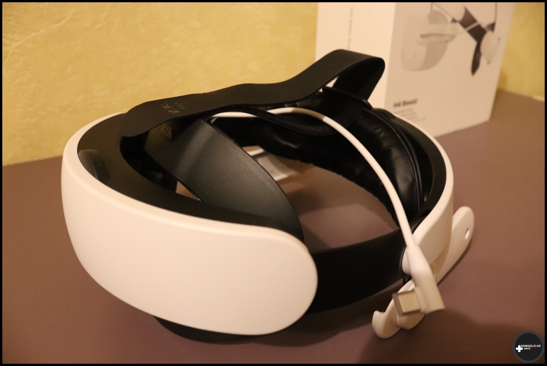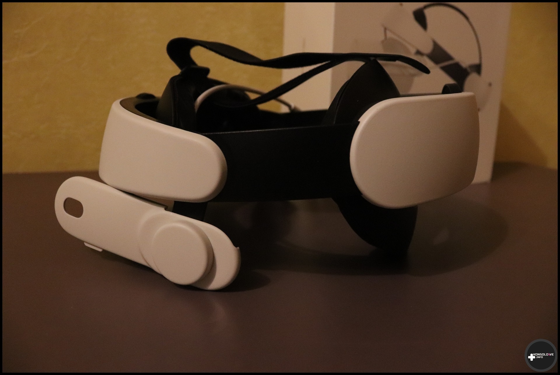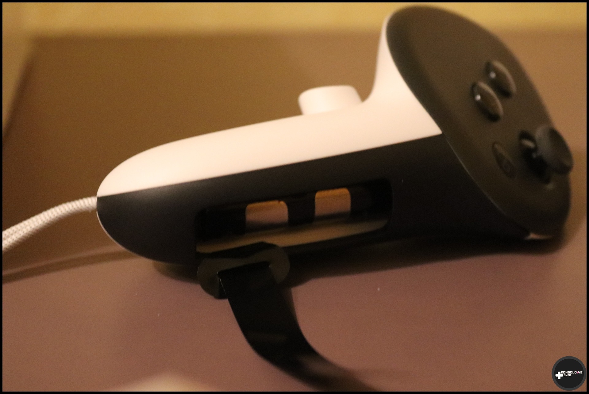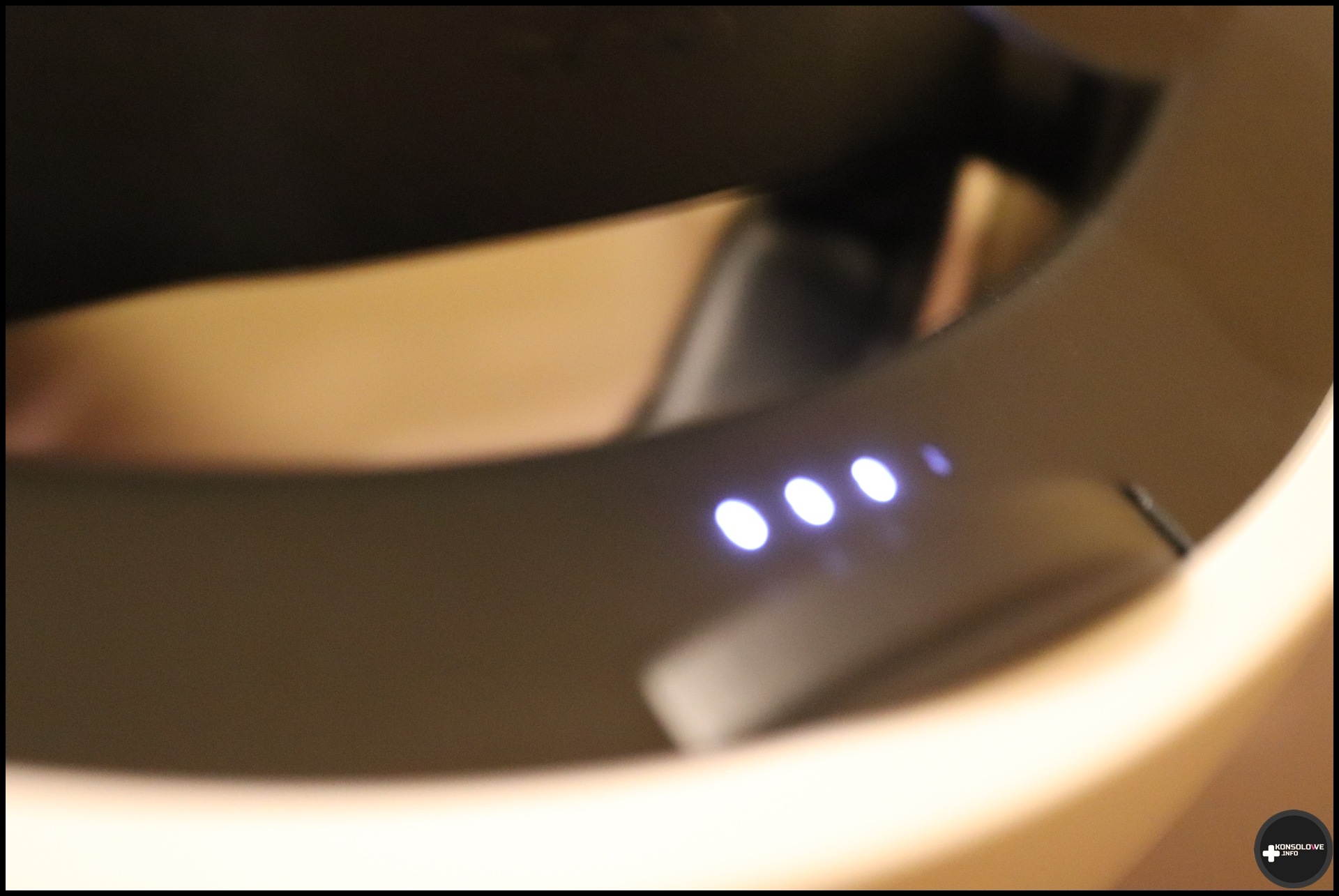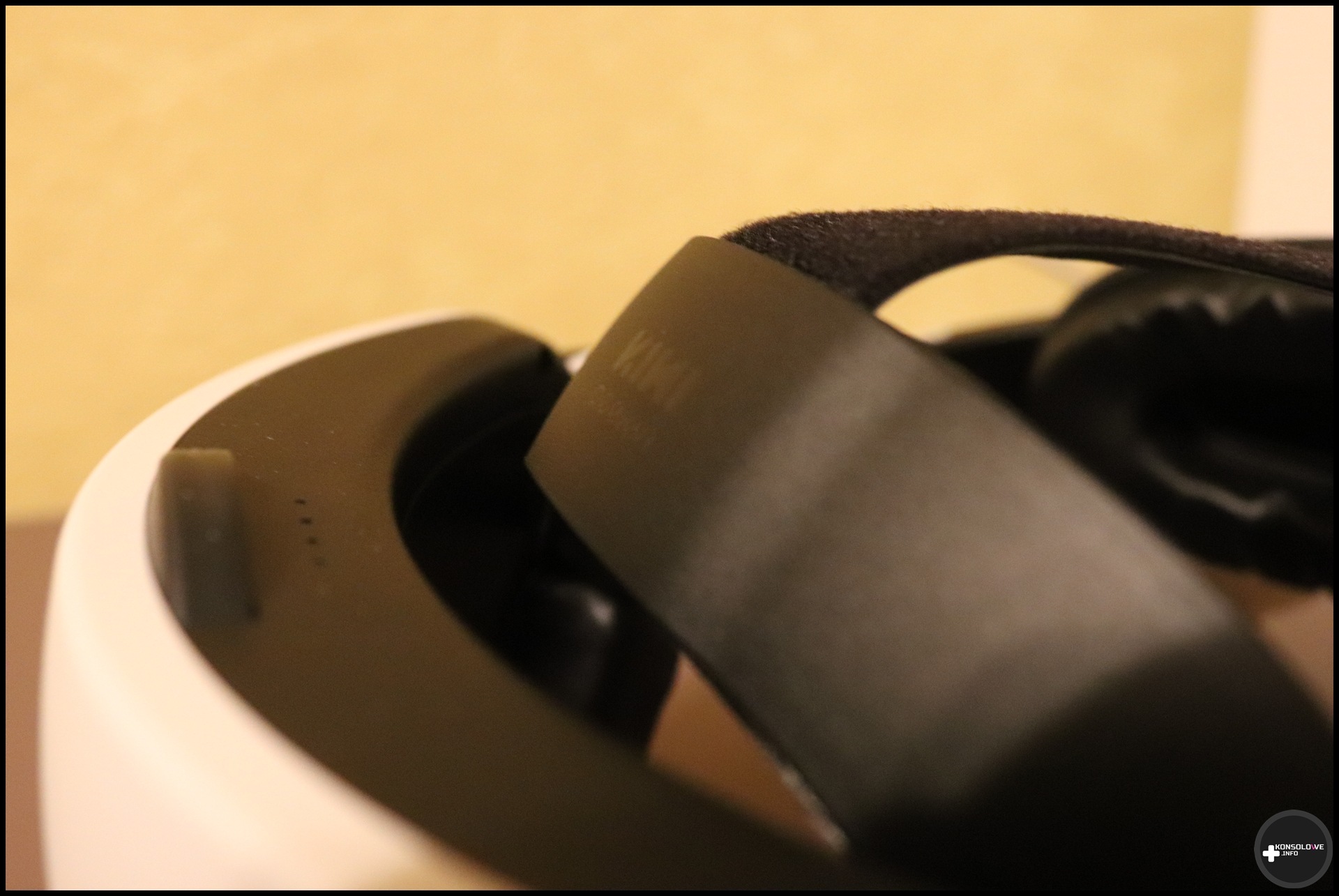 Opaska ta, co bardzo istotne, posiada także wbudowany akumulator. Ładujemy go oczywiście za pomocą portu USB typu C. Sprawdziłem naturalnie czas ładowania – uzupełnienie ładunku od 0% do 100% zajmuje zaledwie około godziny. Jest to więc bardzo dobry wynik. W pełni naładowana opaska, zależnie od gry, pozwala na ogół na jednokrotne naładowanie gogli. Chciałoby się więcej, ale zawsze to coś. Szkoda natomiast, że nie zdecydowano się na lepsze poprowadzenie kabla przekazującego ładunek od akumulatora opaski do gogli przez to, kiedy nie chcemy z niego korzystać, zwisa pod dość dziwnym kątem. Doceniam natomiast zamontowanie 4 diod. Sygnalizują nam one, w jakim stopniu (do 25%, połowy, 75% i do 100%) naładowany jest akumulator opaski.