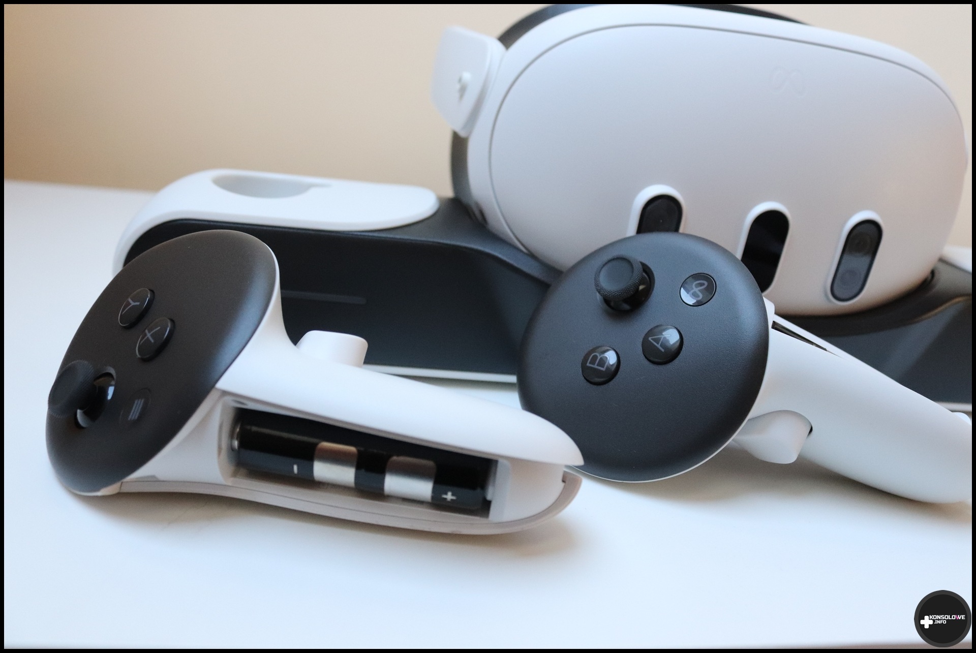 Nie przeczę, że jestem fanem wszelkiego rodzaju stacji dokujących. Czy to smartwatch, czy pad albo kontrolery Sense – zawsze lubię, kiedy sprzęt ma swoje stałe miejsce. Nie tylko pozwala to na utrzymywanie elektroniki w pewnym porządku, ale jednocześnie sprawia, że mam pewność, że podnoszony sprzęt zawsze ma naładowany akumulator. Bardzo chętnie skorzystałem wobec tego z możliwości sprawdzenia stacji dokującej od firmy Maecker. Opakowanie jest dość długie i stosunkowo płaskie – nie powinno to jednak dziwić, bo stacja jest bardzo smukła. W opakowaniu oprócz samej stacji znajdziemy też wtyczkę (co jest sporym plusem w dzisiejszych czasach) oraz dwa kable USB-C, ale też baterie i specjalne osłonki na kontrolery Touch. Warto bowiem zaznaczyć, że testowana stacja dokująca pozwala na ładowanie nie tylko gogli Meta Quest 3, ale też pary kontrolerów. Zanim przejdę do kontrolerów, skupię się jeszcze na stacji. Jest ona podświetlana (choć podświetlenie łatwo można wyłączyć), a ponadto posiada dodatkowy port USB typu C. Dzięki niemu możemy ładować chociażby powerbank czy smartfona. Co mnie bardzo miło zaskoczyło to fakt, że port ten obsługuje szybkie ładowanie. Wszystkie porty znajdują się z tyłu, wobec czego stacja z przodu wygląda naprawdę przyjemnie, wręcz elegancko. Niestety nie mogę nie wspomnieć o pewnych wadach.