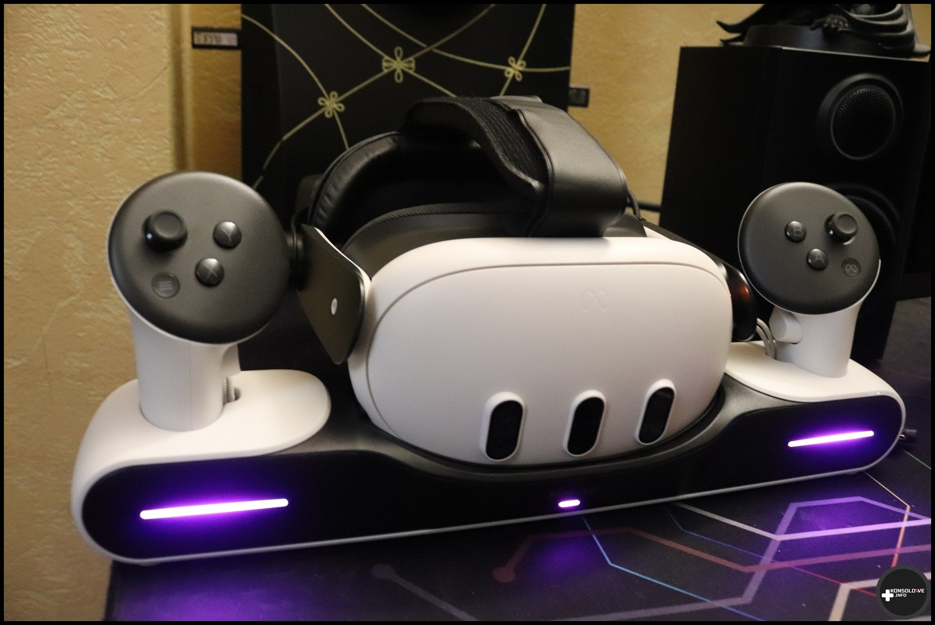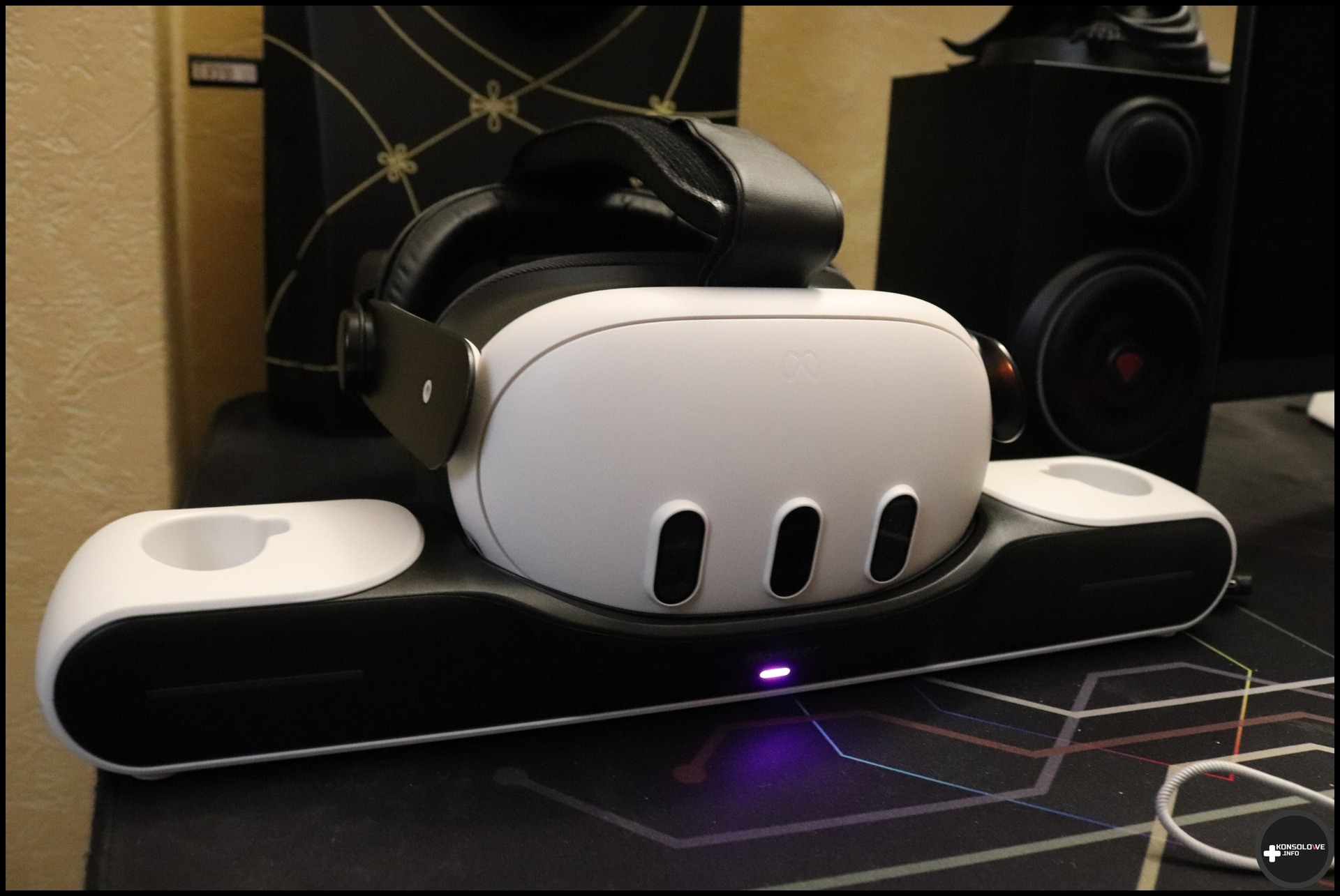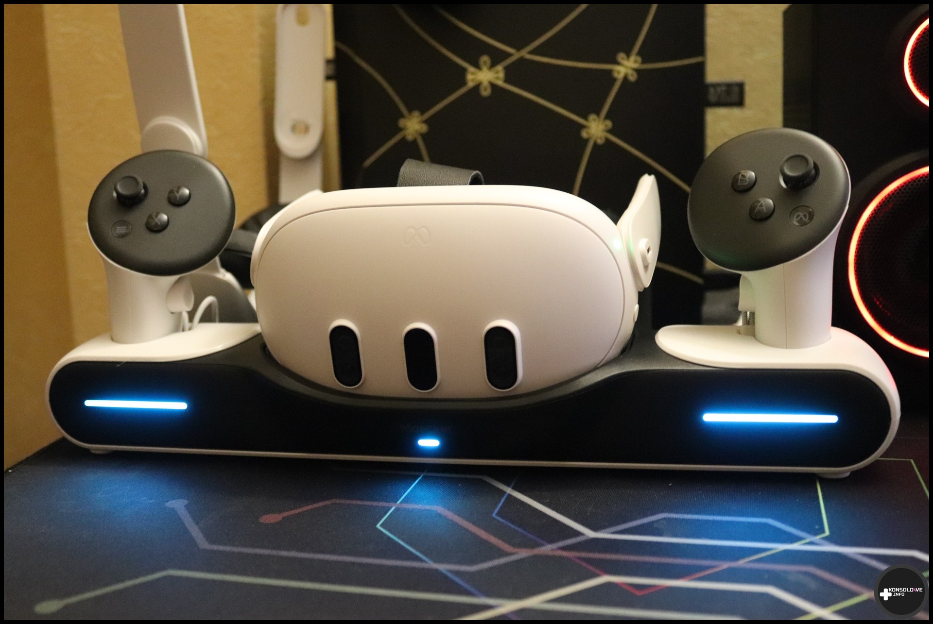 Na zakończenie testu stacji dokującej muszę napisać nieco o podświetleniu tego sprzętu. Plusem jest jasne wskazywanie stanu akumulatorów – zarówno gogli, jak i kontrolerów. Kiedy diody świecą się na różowo/fioletowo, sprzęty ładują się. Natomiast niebieskie podświetlenie oznacza naładowanie podłączonych urządzeń. Podświetlenie można też całkowicie wyłączyć za pomocą przycisku z tyłu stacji dokującej. Na pewno docenią to osoby, których nic nie może rozpraszać podczas zasypiania. Gorzej, że nie da się wyłączyć dość głośnego dźwięku wydawanego przez stację. Słyszymy go przy wkładaniu kontrolerów/gogli do odpowiednich gniazd i to jeszcze byłbym w stanie przełknąć. Nie mogę natomiast zaakceptować losowości tego dźwięku.