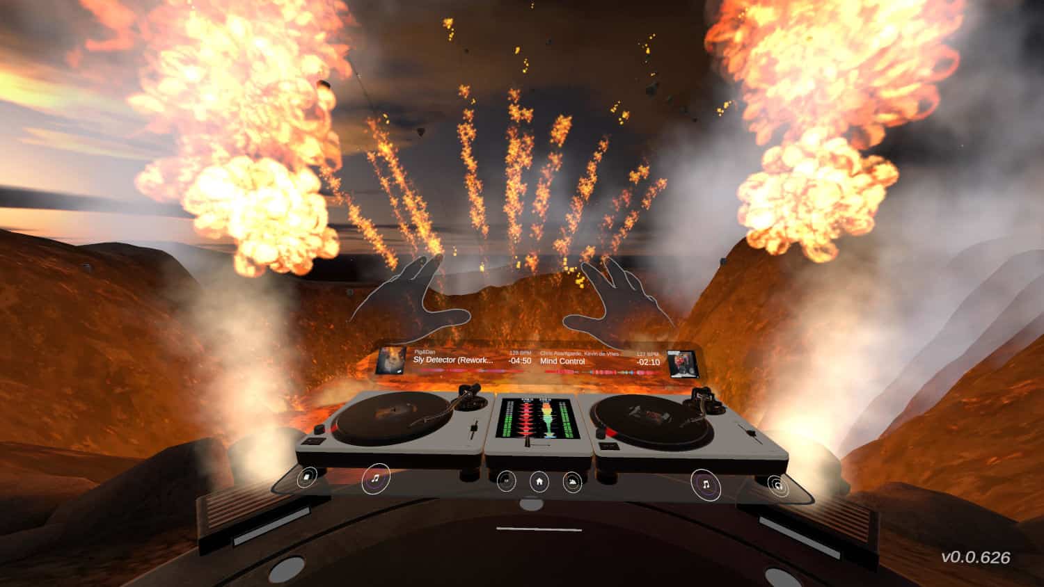 Pierwsze uruchomienie djay VR wita nas krótkim samouczkiem, który szybko przeprowadza nas przez obsługę didżejskiej konsoli. Przed nami leży dwuwinylowy deck z podstawowymi suwakami tempa i głośności każdej ze ścieżek. Z boku widnieje również guzik odsłuchu, który aktywuje możliwość szybkiego sprawdzenia podrzędnej ścieżki, przykładając rękę do boku gogli. Nie jest to najbardziej rozbudowana konsola, ba, rzekłbym nawet, że jest ona wręcz ascetyczna, ale rozumiem ten wybór ze strony Algoriddim. Prosty w obsłudze deck jest, póki co, najbardziej sensowną opcją z uwagi na wciąż toporną technologię śledzenia rąk w VR.