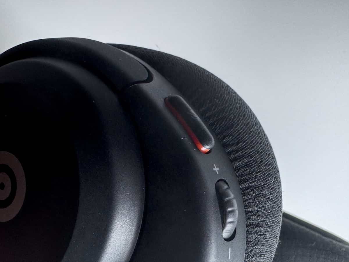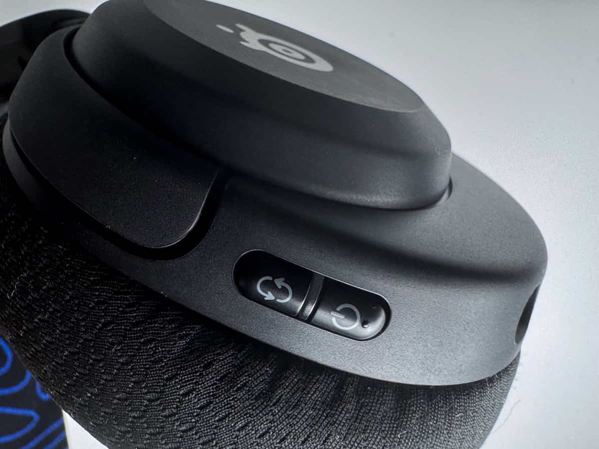 Bardzo ważnym aspektem każdych bezprzewodowych słuchawek są elementy służące kontroli, które tradycyjnie umieszczone są na kablu. SteelSeries w modelu Arctis Nova 5P zdecydowało się na bardzo sensowne rozdzielenie tych przełączników między obie muszle słuchawek. Na lewej słuchawce znajdziemy przełącznik wyciszenia wbudowanego mikrofonu oraz płynnie chodzące pokrętło zmiany głośności. Prawa muszla natomiast posiada przyciski odpowiedzialne za przełączanie między trybami Bluetooth i 2.4GHz, a także włącznik służący jednocześnie za kontrolę mediów przy odtwarzaniu muzyki.