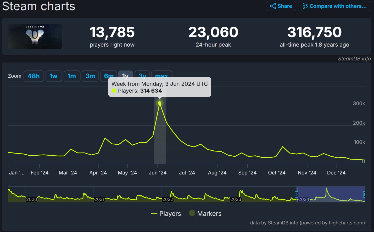 W czerwcu 2024 roku na rynek trafił w mojej opinii najlepszy dodatek do Destiny 2 – Ostateczny kształt. Saga o świetle i ciemności po 10 latach dobiegła końca. Po jego wydaniu Bungie wcale nie zamierzało porzucić ukochanej marki, jednak to, co zaoferowali graczom w drugiej połowie 2024 roku okazało się bardzo rozczarowujące. Nie ulega wątpliwości, że studio mocno upodobało sobie odcinanie kuponów. Takie aktywności sezonowe, jak Święto Utraconych (Halloween), czy Świtanie (zimowe wydarzenie) przestało zachęcać do gry nawet największych fanów. Destiny 2 od czerwcowej premiery dodatku Ostateczny kształt do zimowego wydarzenia zaliczyło ogromny spadek graczy na Steam. Jak widzicie na poniższym obrazku, w dniu premiery w grze było ponad 300.000 graczy. Dziś zostało ich zaledwie 20.000.