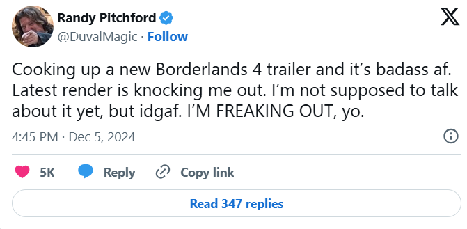 Randy Pitchfork wspomniał na swoim Twitterze, że nowy zwiastun Borderlands 4 jest „badass af”. I chociaż miał o nim jeszcze nic nie mówić – no cóż, właśnie to zrobił! Jest więc spora szansa, że już niedługo zobaczymy, jak wygląda rozgrywka i nowy świat.