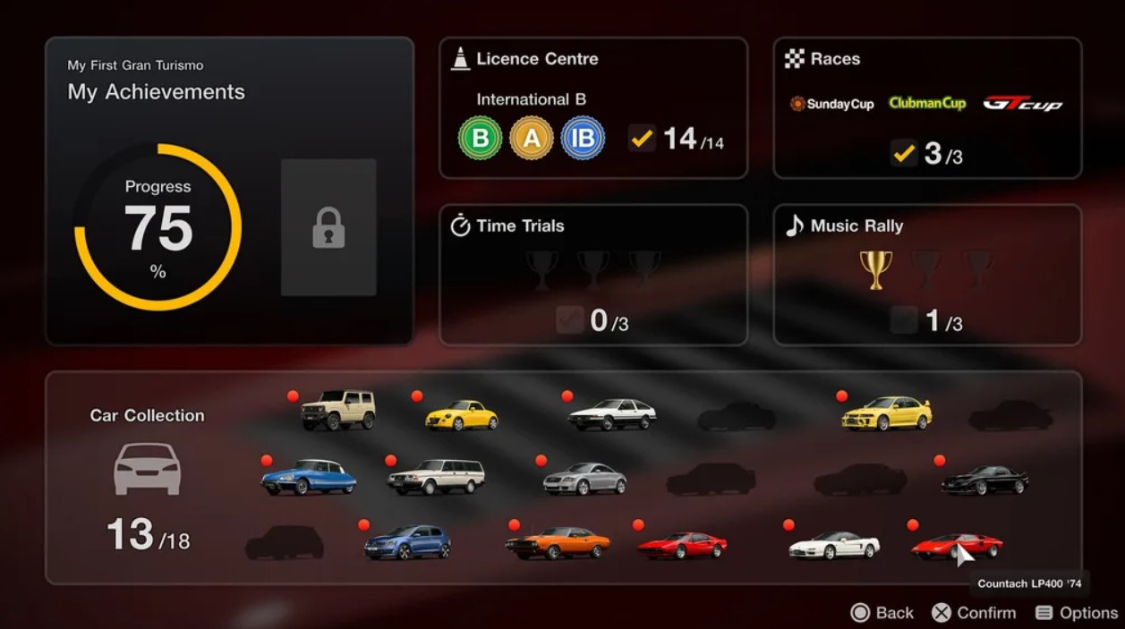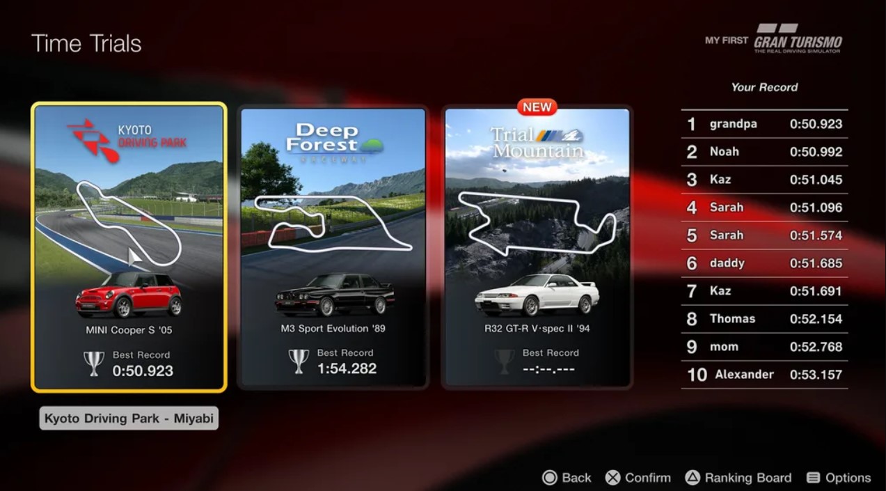 W zestawie znajduje się 18 unikalnych samochodów, z których każdy ma swój własny charakter. Gracze będą jeździć nimi po kultowych torach, które niektórzy weterani Gran Turismo mogą uznać za nostalgiczne, a mianowicie Kyoto Driving Park, Deep Forest Raceway i Trial Mountain Circuit.